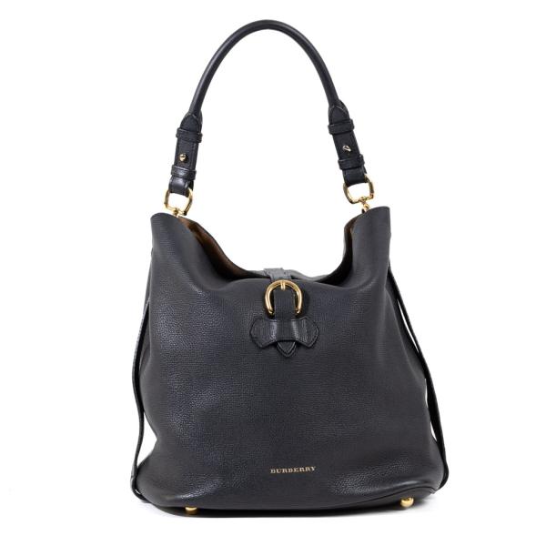 Burberry Sycamore buckle hobo bag in black grained leather. Featuring gold-toned hardware, single top leather handle, strap and buckle closure at front. This opens to a brown suede lining interior with a patch pocket. Approximate dimensions: 29cm(W) x 32cm(H) x 15cm(D), 17cm handle drop. With Entrupy Certificate of Authenticity. (Pre-owned)