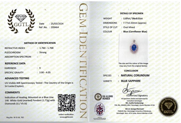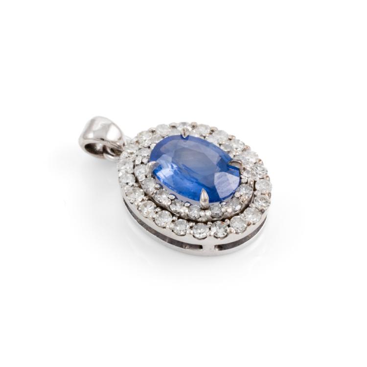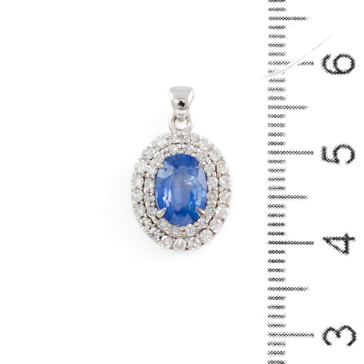 Sapphire and Diamond pendant with an oval shape Ceylon natural blue Sapphire of 1.07ct and round natural Diamonds totalling 0.51ct (Estimated grading: G VS-SI). 14ct white gold. No chain provided. Weight: 1.7g. With GGTL Report #209464. (As new)