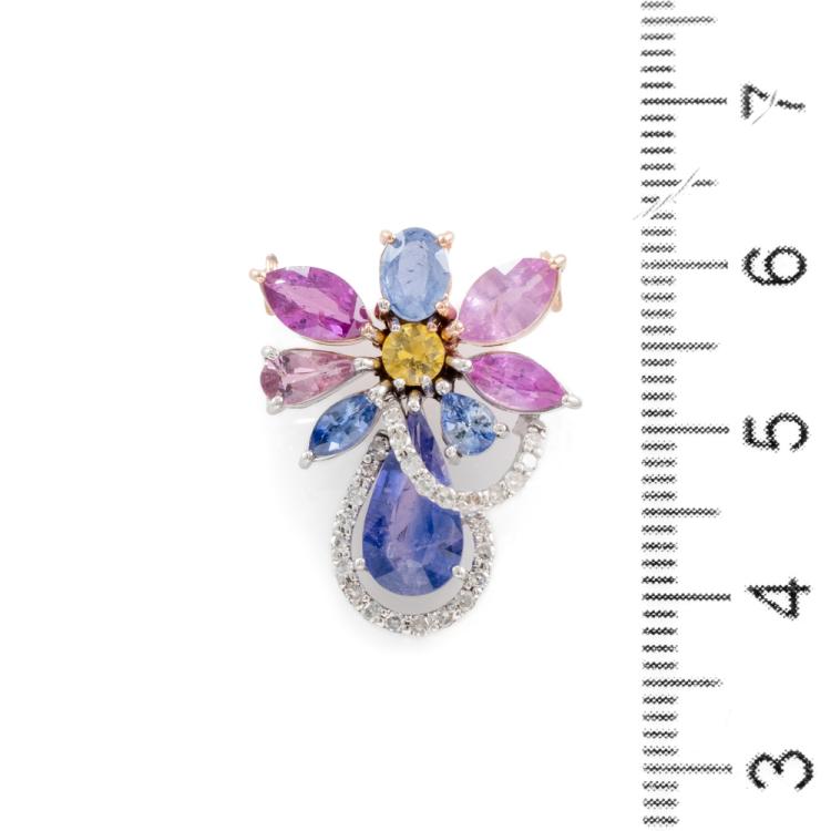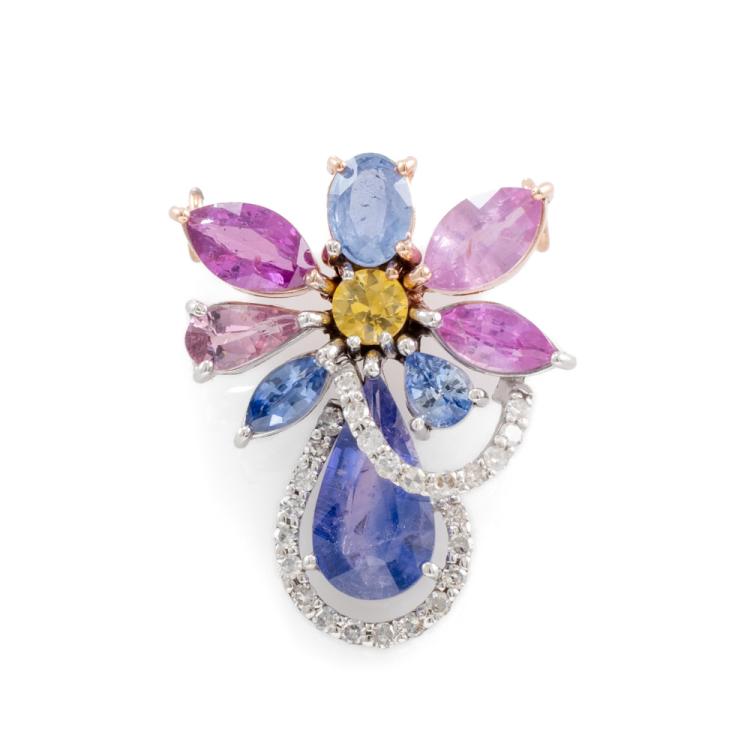Sapphire and Diamond pendant with mixed cut multi-colour Ceylon natural Sapphires totalling 4.53ct and round natural Diamonds totalling 0.30ct (Estimated grading: G-H SI). 14ct rose & white gold. No chain provided. Weight: 3.1g. With GGTL Report #209449. (As new)