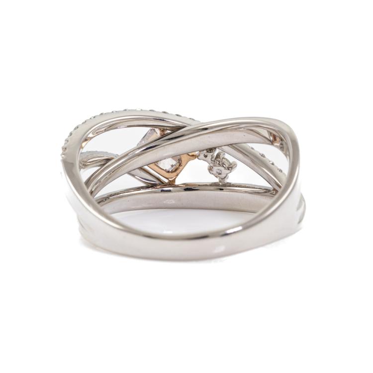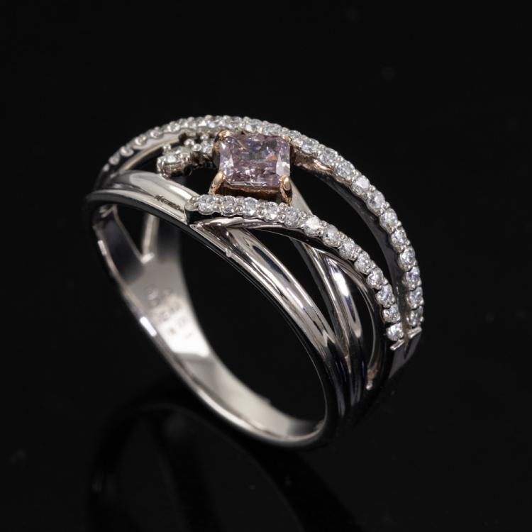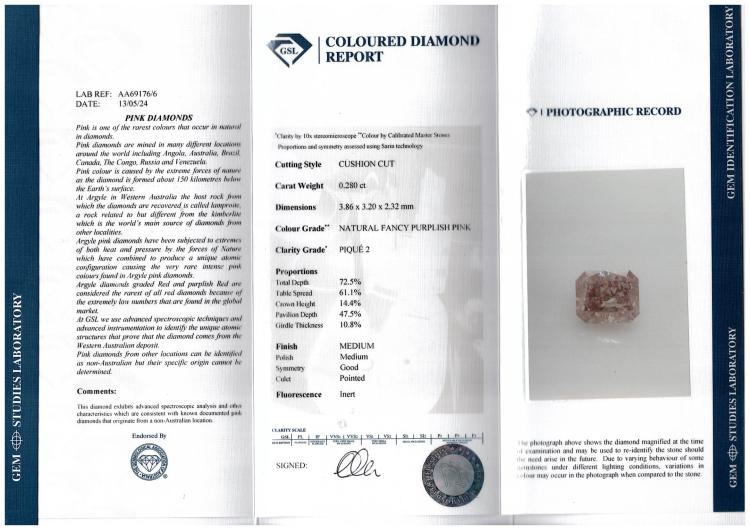 Diamond ring with centre cushion cut natural Pink Diamond of 0.28ct (GSL Report graded as Natural Fancy Purplish Pink P2 #AA69176/6) with surrounding round natural Diamonds totalling 0.25ct. Platinum 950 and 18ct rose gold. Ring size M. Band width 2.5mm - 3.4mm. Weight: 6.4g. (Pre-owned)