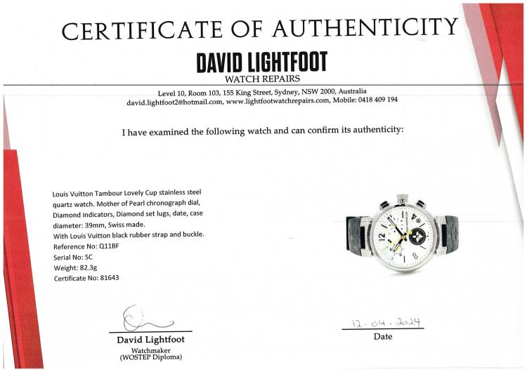 Louis Vuitton Tambour Lovely Cup stainless steel quartz watch. Mother of Pearl chronograph dial, Diamond indicators, Diamond set lugs, date, case diameter: 39mm, strap length: 18.5cm, Swiss made. Ref# Q11BF. With Louis Vuitton black rubber strap and buckle. With Certificate of Authenticity and David Lightfoot Watchmaker full service invoice dated 24/04/2024. 12 month David Lightfoot Watchmaker warranty from the date of full service. (Pre-owned)