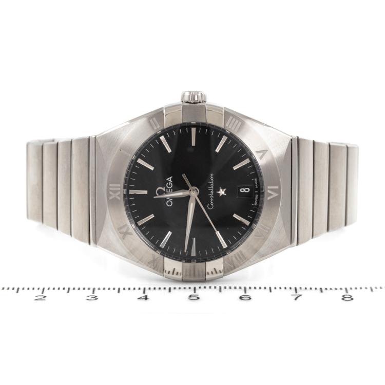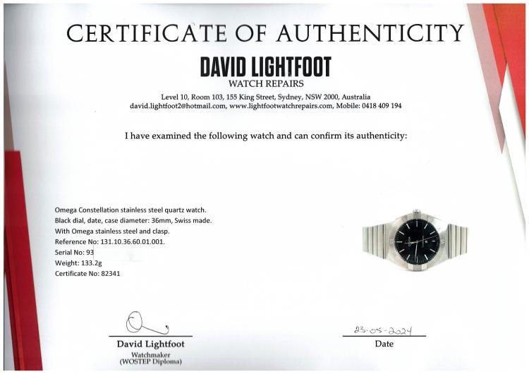 Omega Constellation stainless steel quartz watch. Black dial, date, case diameter: 36mm, wrist size: 19cm, Swiss made. Ref# 131.10.36.60.01.001. With Omega stainless steel and clasp. With Omega stainless steel and clasp. With Certificate of Authenticity, Omega International Warranty Card 29/02/2024 and Omega box. Balance of 5 year Omega manufacturer warranty applies. (Pre-Owned)