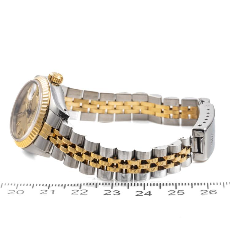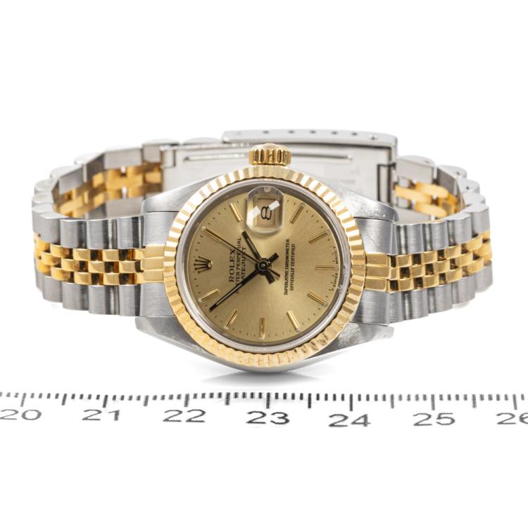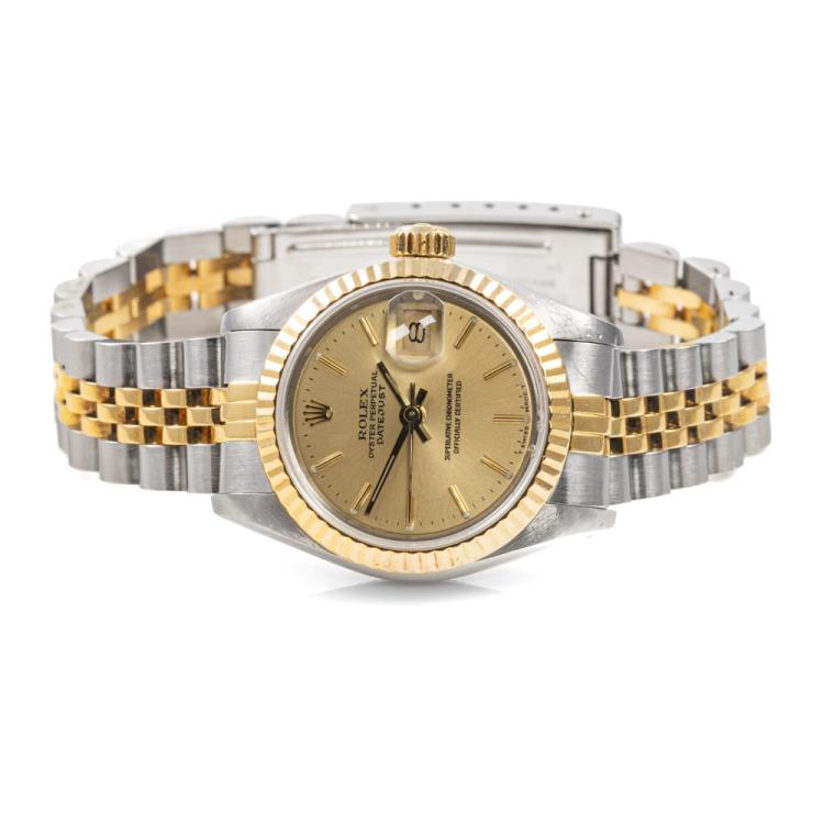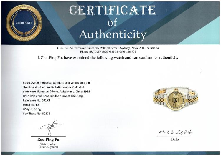 Rolex Oyster Perpetual Datejust 18ct yellow gold and stainless steel automatic ladies watch. Gold dial, date, case diameter: 26mm, wrist size: 16.5cm, Swiss made. Ref# 69173. Circa: 1988. With Rolex two-tone Jubilee bracelet and clasp. With Certificate of Authenticity and Rolex box with Rolex gift bag. 3 month FSA warranty (Pre-owned)