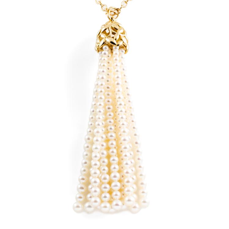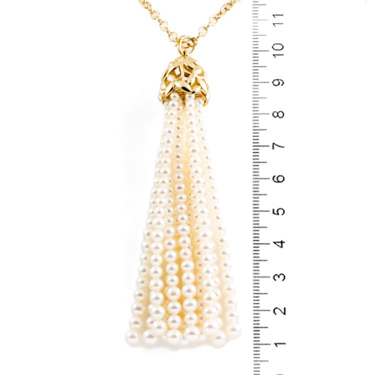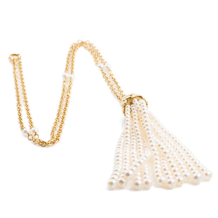 Tiffany & Co. Paloma Picasso Olive Leaf Pearl Tassel Necklace with Freshwater Cultured Pearls of 4mm - 5.5mm. 18ct yellow gold with 71cm Tiffany & Co 18ct yellow gold chain. Tassel length: 9cm. Weight: 36.3g. With Tiffany & Co pouch. With Certificate #418617. (Pre-owned)