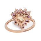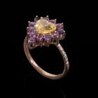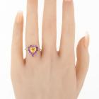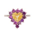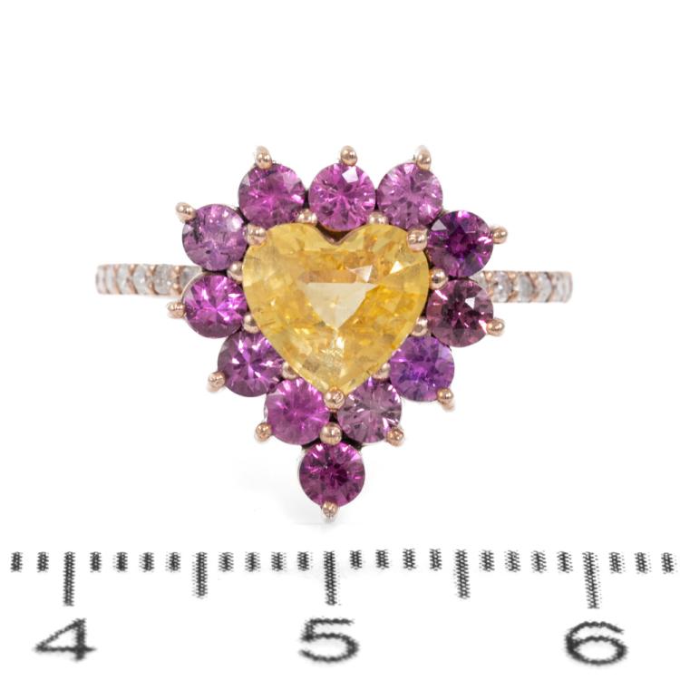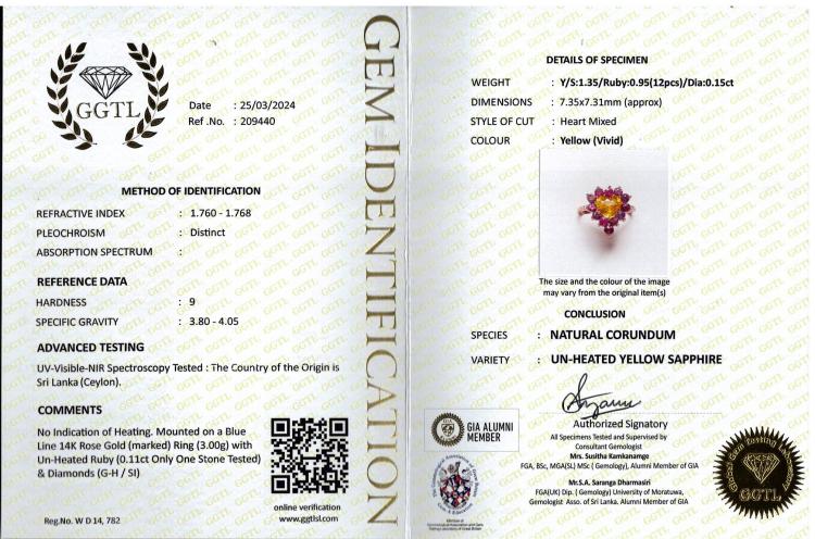 Ring with centre heart shape natural Ceylon unheated yellow Sapphire of 1.35ct, round unheated natural Ruby totalling 0.95ct and round natural Diamonds totalling 0.15ct. 14ct rose gold. Ring size K1/4. Band width: 1.3mm. Weight: 3.0g. With GGTL Report #209440. (As new)