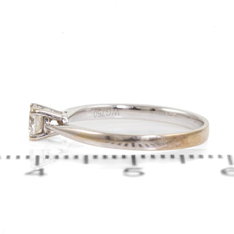 Diamond solitaire ring with a round Natural Diamond of 0.18ct. 18ct white gold. Ring size G. Band width: 1.7mm. Note rhodium plating faded on band. Weight: 1.4g. (Pre-owned)