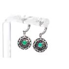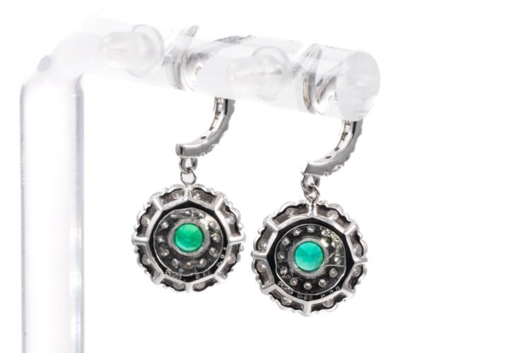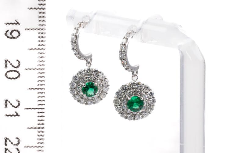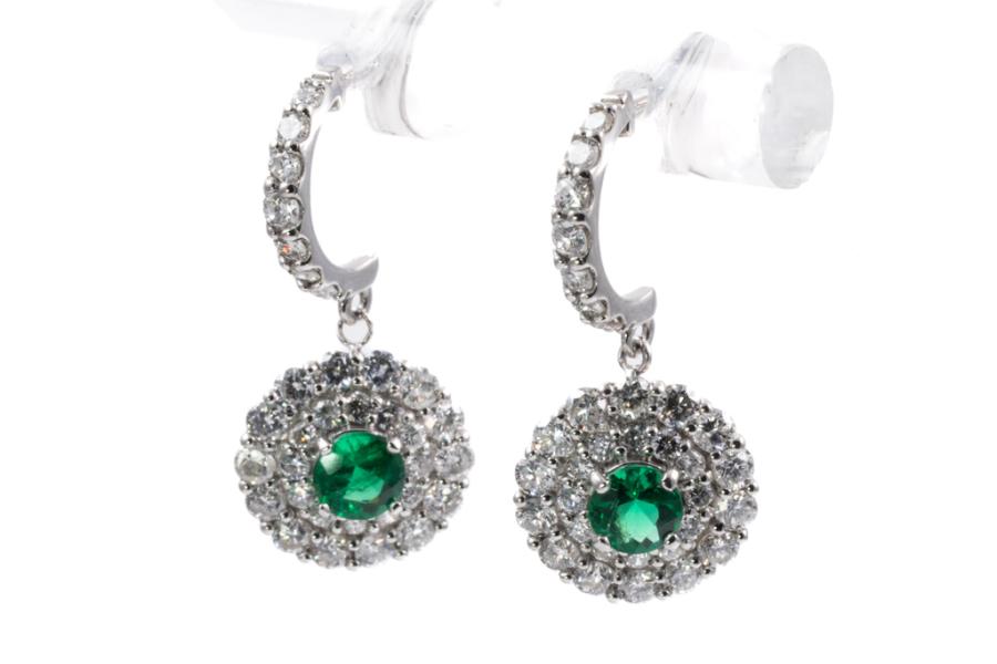 Emerald and Diamond earrings with round Natural Emeralds of 0.41cts and round Natural Diamonds totalling 1.16cts (Estimated grading: G SI). Platinum - 900. Weight: 3.57g. (Pre-owned)