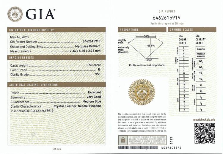 A loose marquise cut Natural Diamond of 0.50ct (with GIA Summary Report of E VS1 #6462615919). (New)