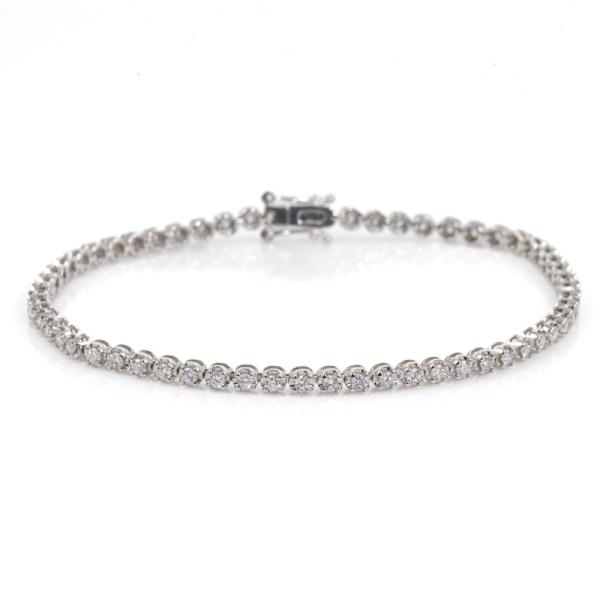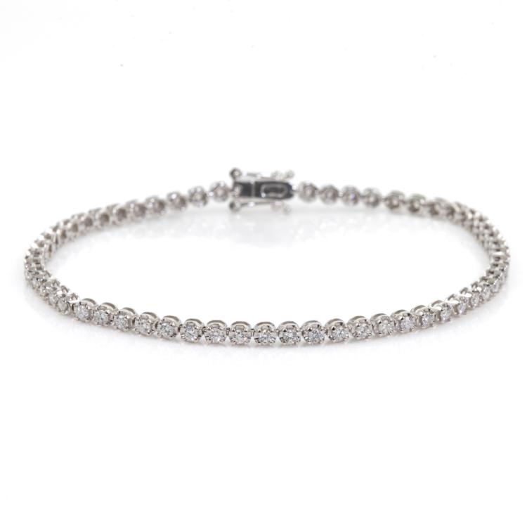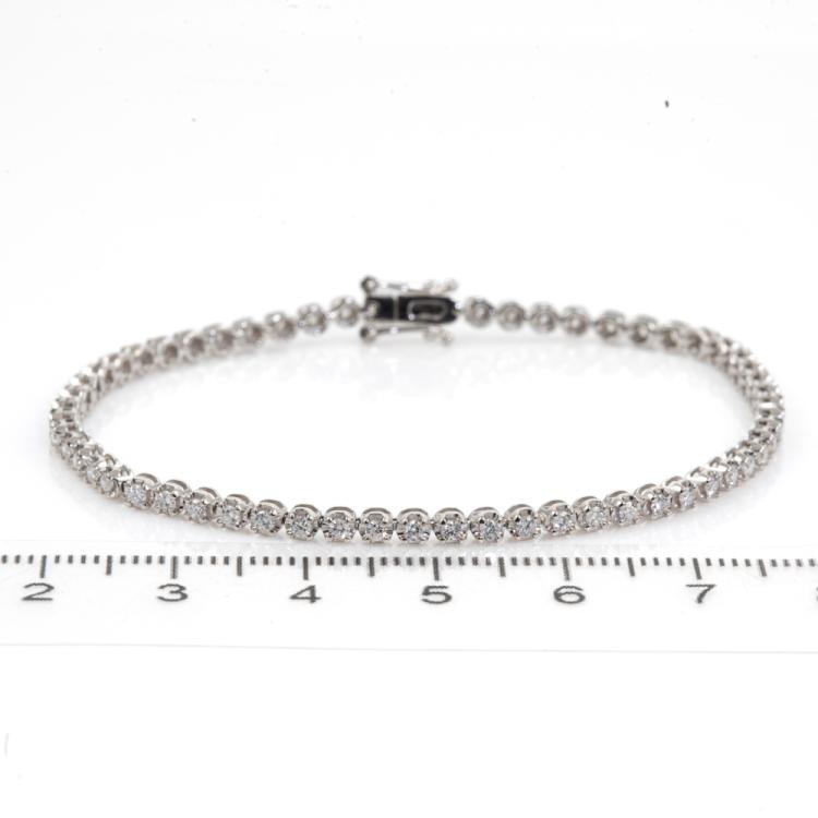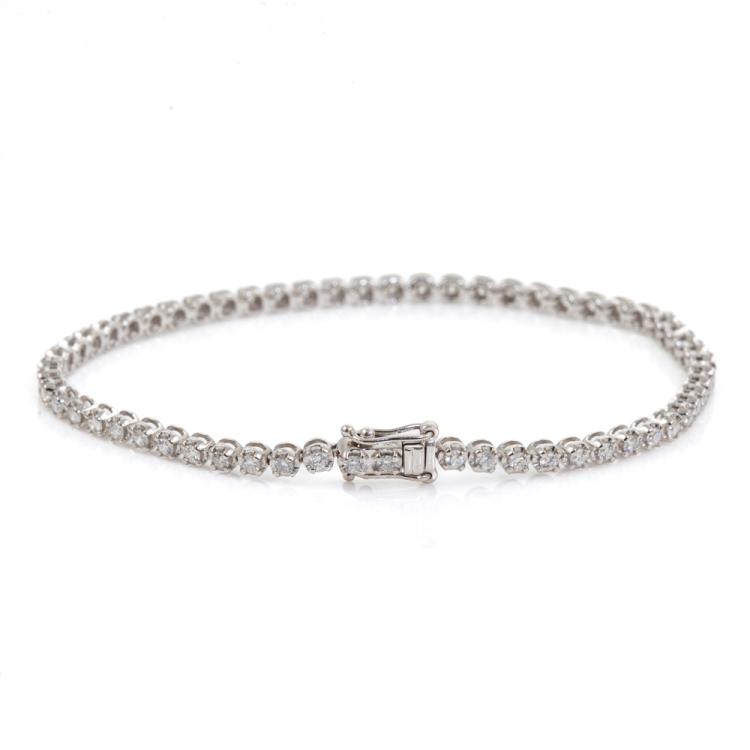 Diamond tennis bracelet with 58 round Natural Diamonds totalling approximately 0.59cts ( Estimated grading: G SI). 18ct white gold. Length: 17cm. Weight: 5.9g (Pre-owned)