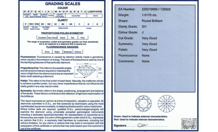 Diamond solitaire pendant with a round brilliant cut Natural Diamond of 1.01ct (with EGL Summary Report graded as J SI1 #220210988). 9ct white gold with 46.5cm 9ct white gold chain. Weight: 5.1g. (Pre-owned)