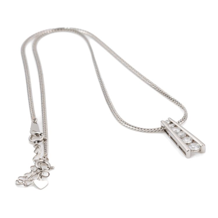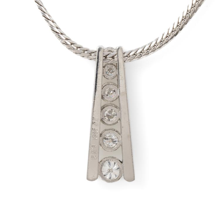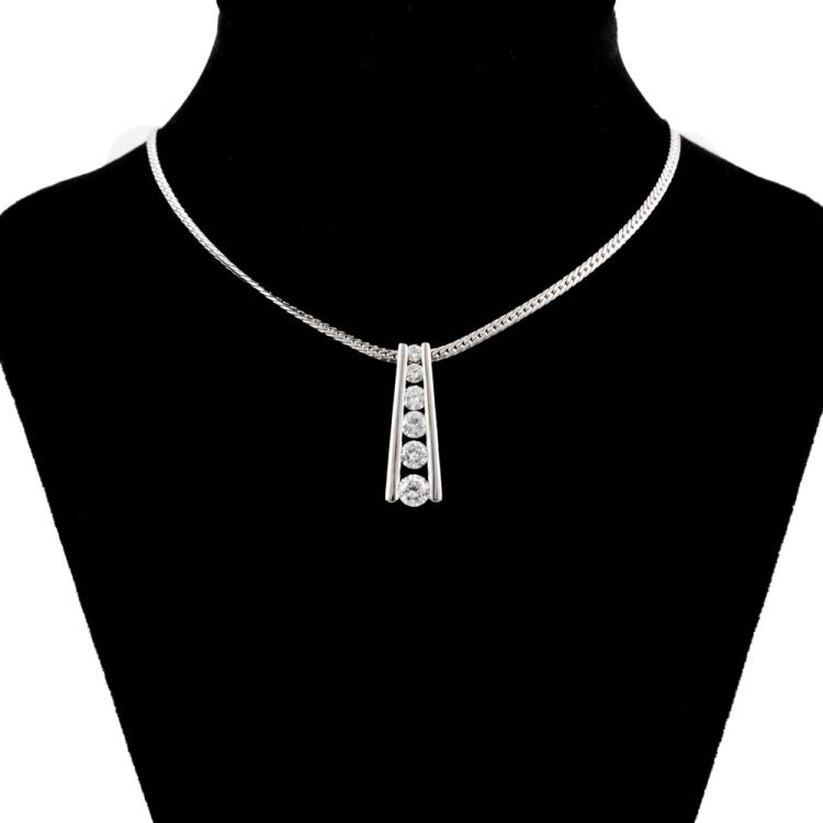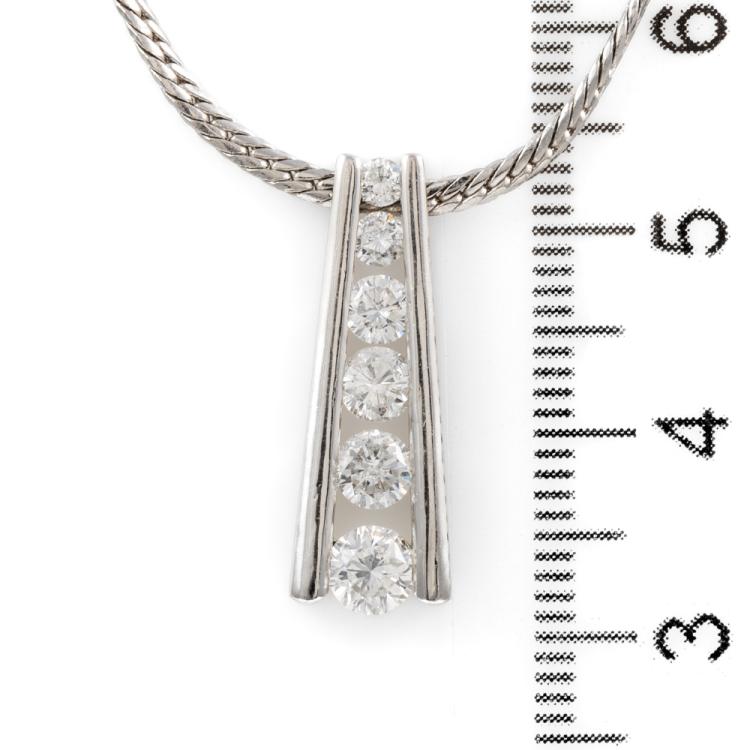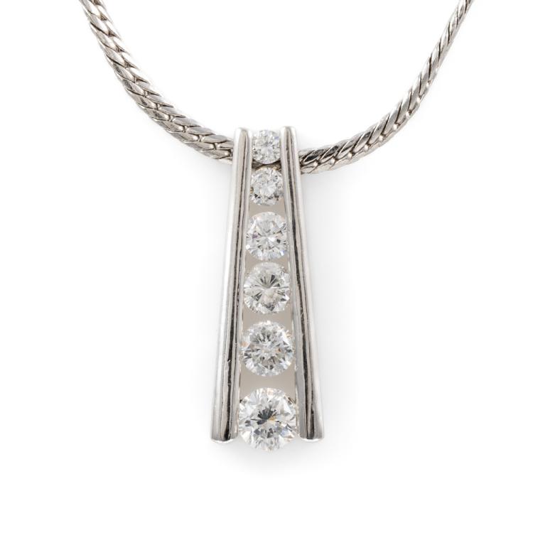 Diamond pendant with graduated round Natural Diamonds totalling 1.02cts (Estimated grading: G-H SI-P1). Platinum-900 with Platinum-850 adjustable 45cm chain. Length of pendant: 2.1cm. Weight: 12.3g. (Pre-owned)