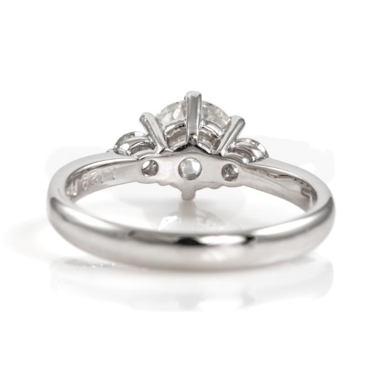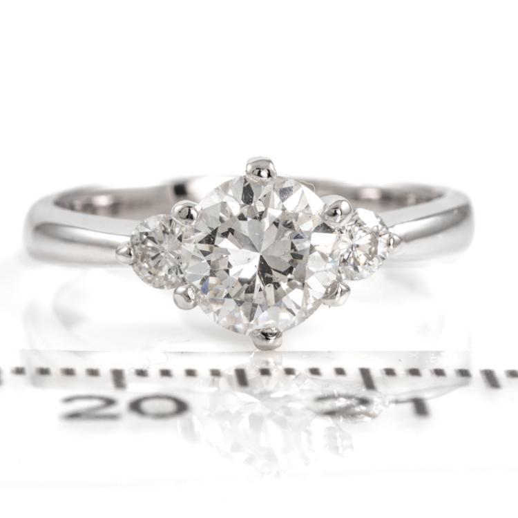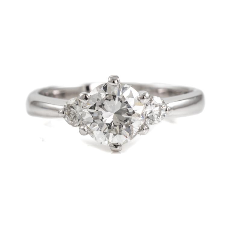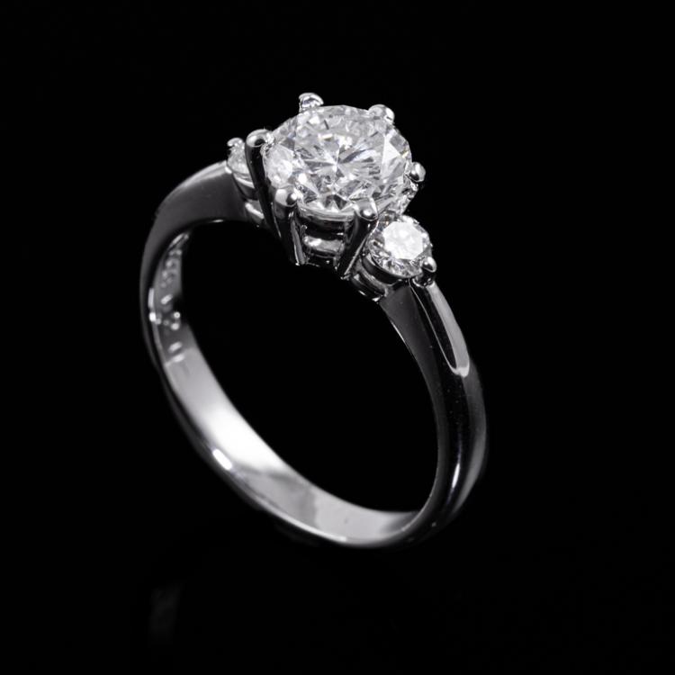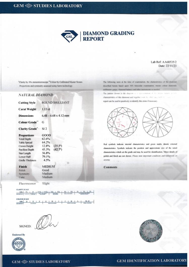 Diamond ring with centre round brilliant cut Natural Diamonds totalling 1.13cts (GSL graded as: G SI2 #AA68535/2) and 2 round Natural Diamonds totalling 0.20cts. Platinum 900. Ring size L. Band width: 2.7mm - 2.0mm. Weight: 5.0g. (Pre-owned)