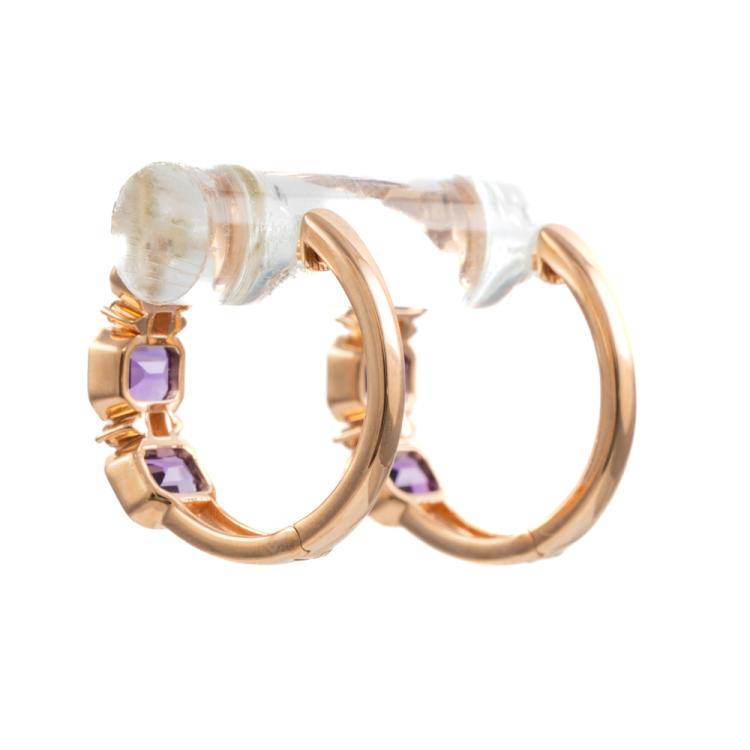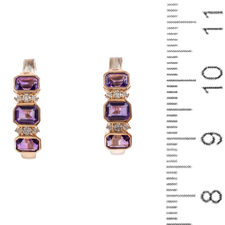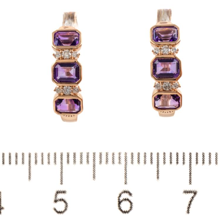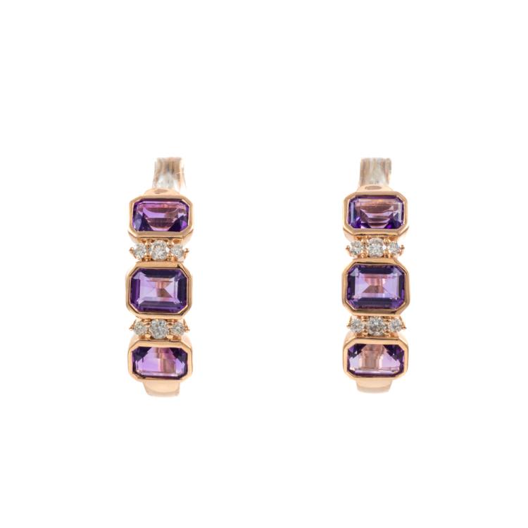 Amethyst and Diamond huggie earrings with emerald cut Natural Amethyst totalling 1.18cts and round Natural Diamonds totalling 0.09cts. 14ct rose gold. Weight: 2.6g. (New)