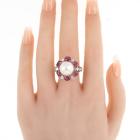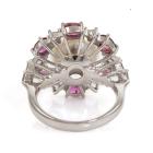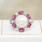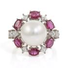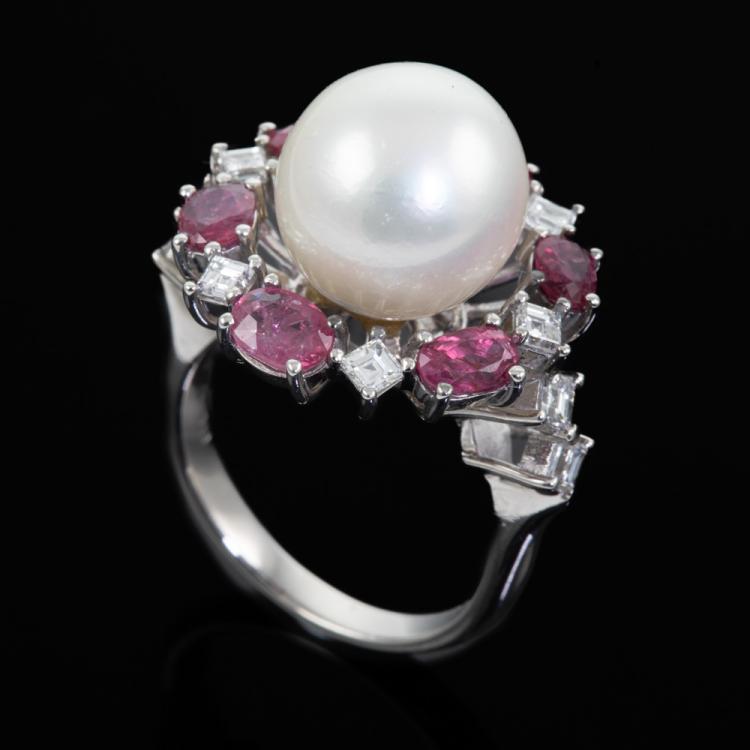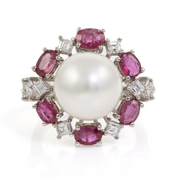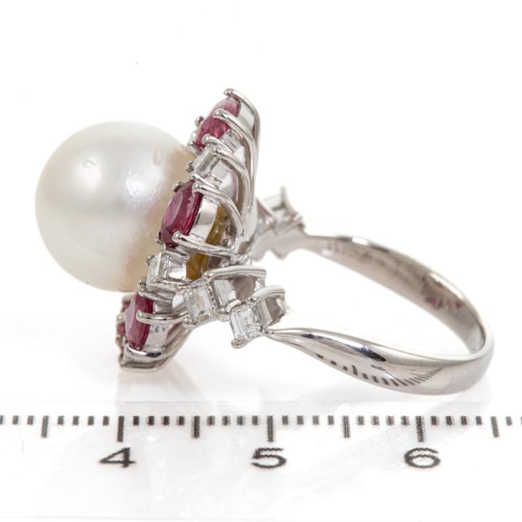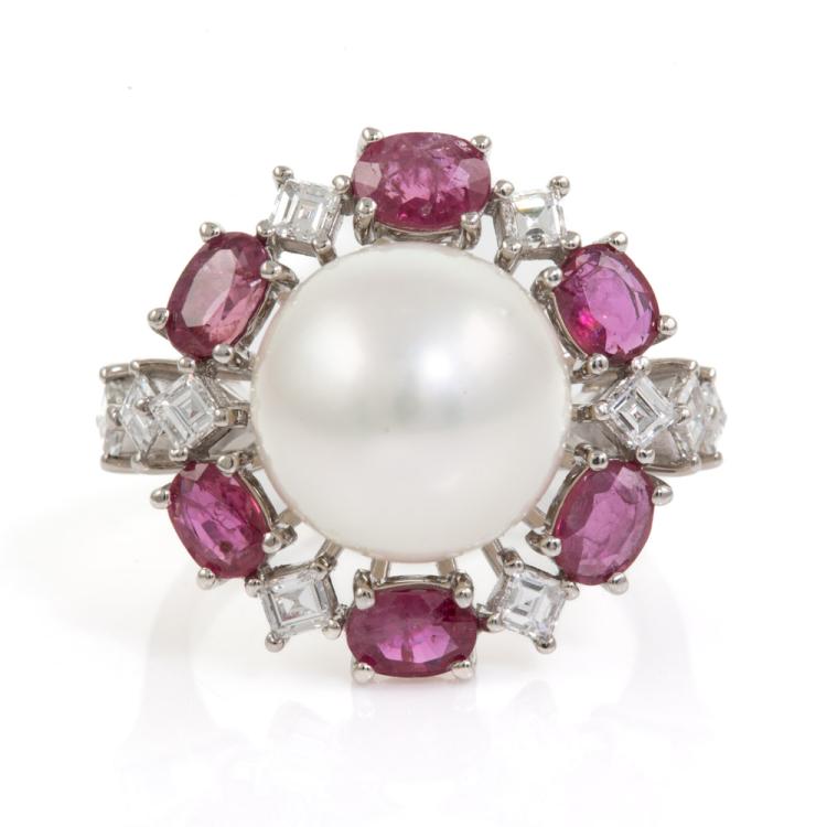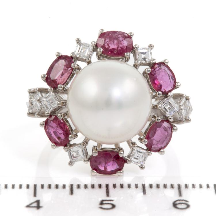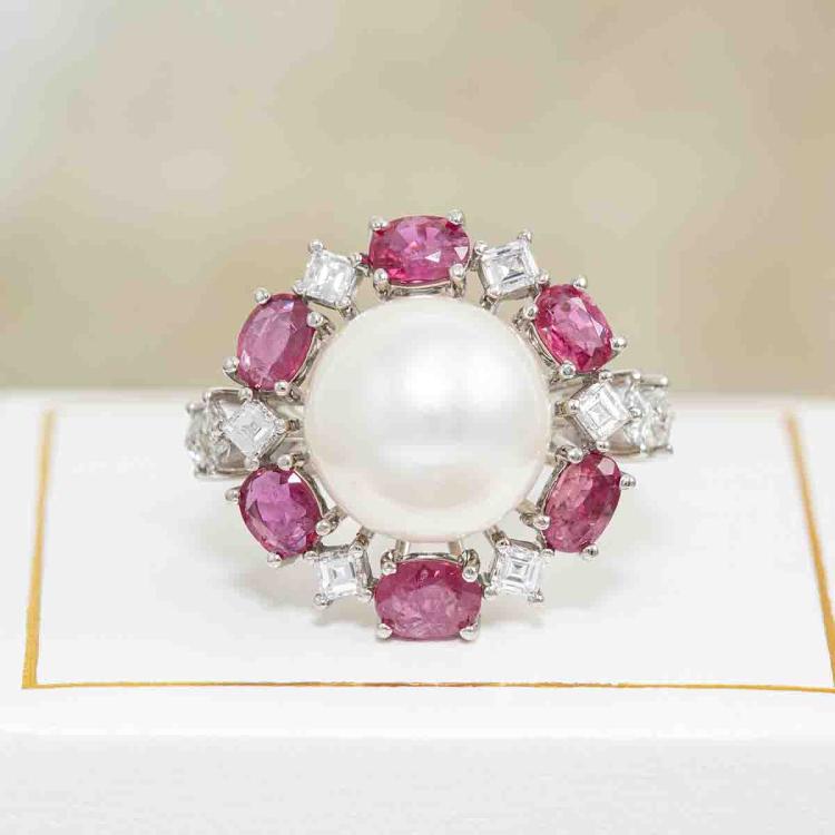 Pearl, Ruby, and Diamond ring with South Sea Pearl of 11.8mm, oval Natural Rubies totalling 2.06cts and carre cut Natural Diamonds totalling 0.80cts (Estimated grading: G-H VS). Platinum 900. Ring size N 1/2. Band width: 2.60mm. Weight: 12.0g. Note - Rubies with surface reaching inclusions. (Pre-owned)