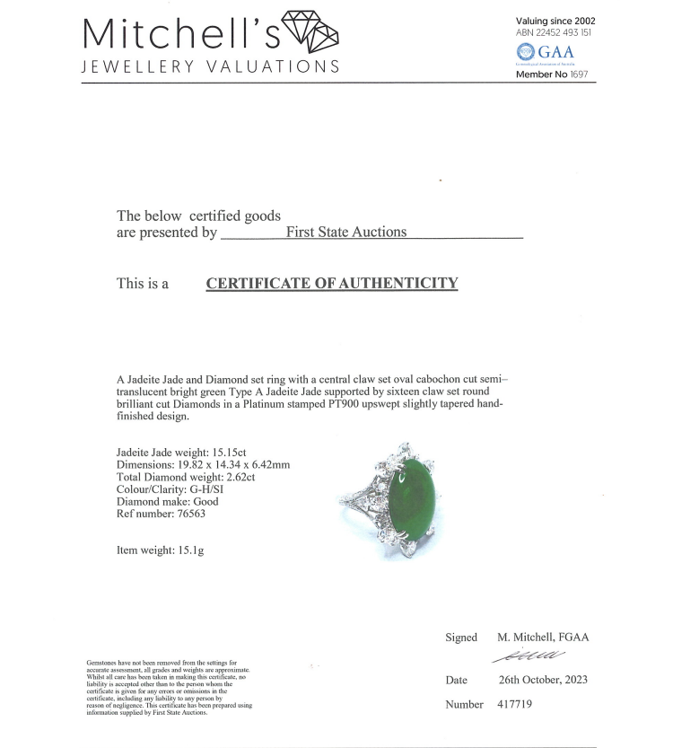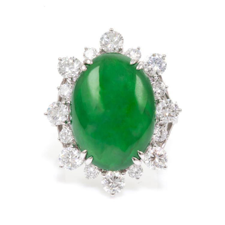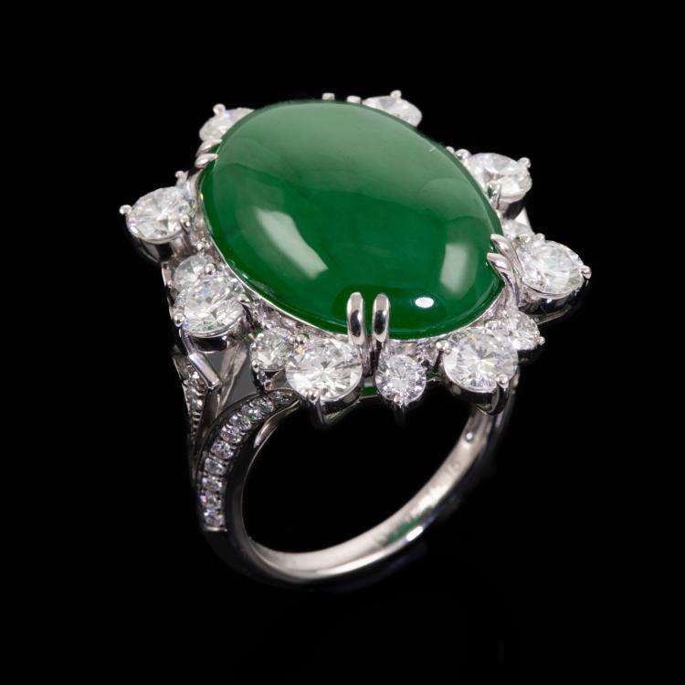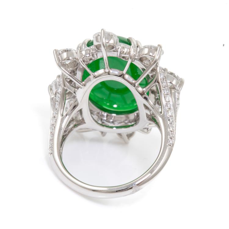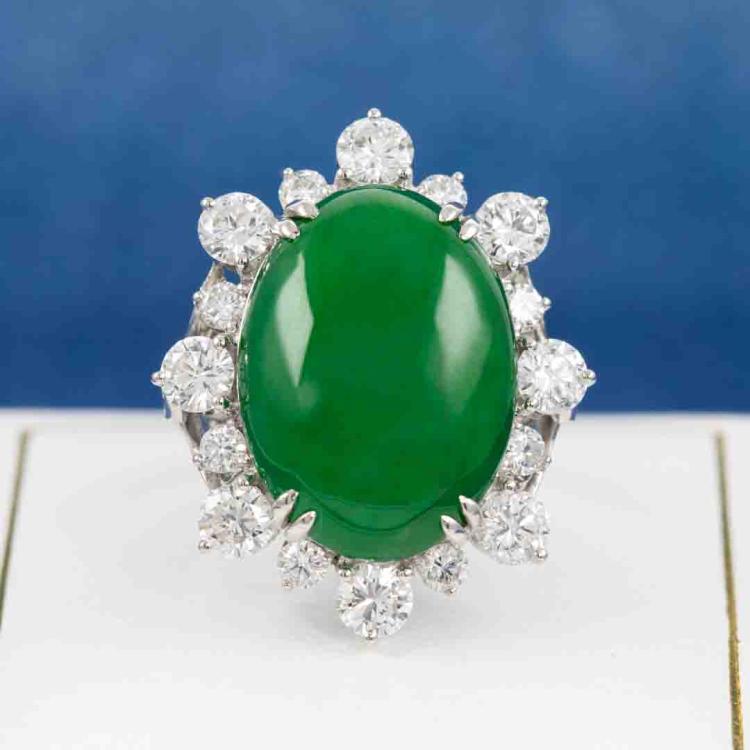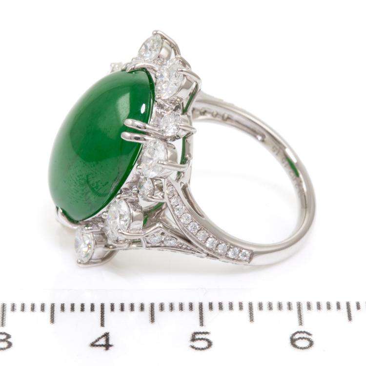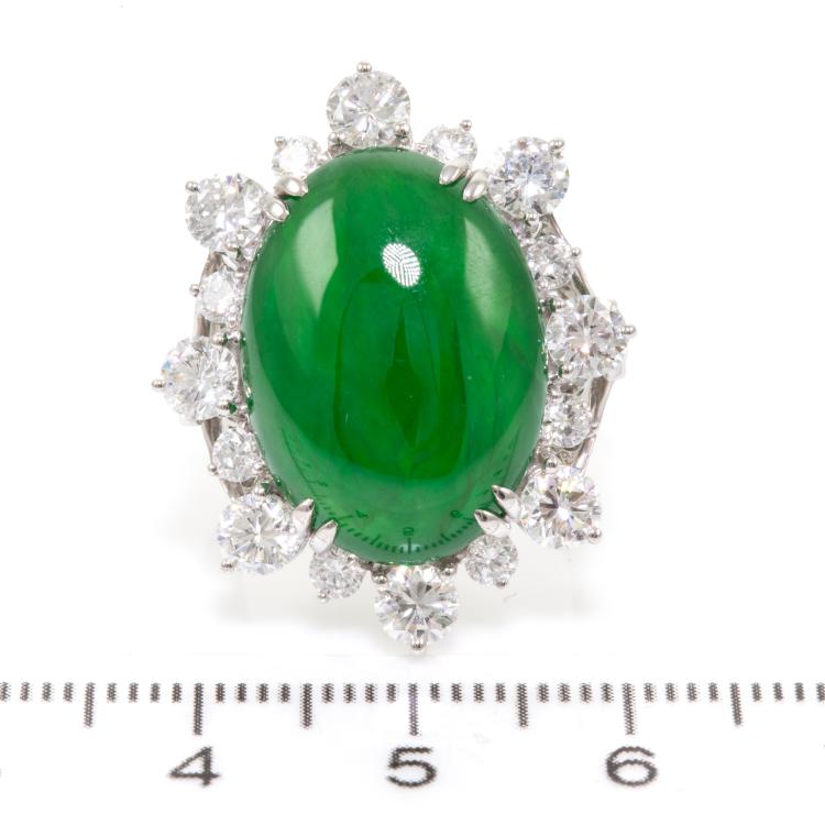 Jade and Diamond ring with oval cabochon cut Natural Jadeite Jade - Type A of 15.15ct and round Natural Diamonds totalling 2.62cts (Estimated grading: G-H SI). Platinum 900. Ring size L1/2 - ring resizing is not recommended. Band width: 2.3mm. Weight: 15.1g. With Certificate #417719. (Pre-owned)