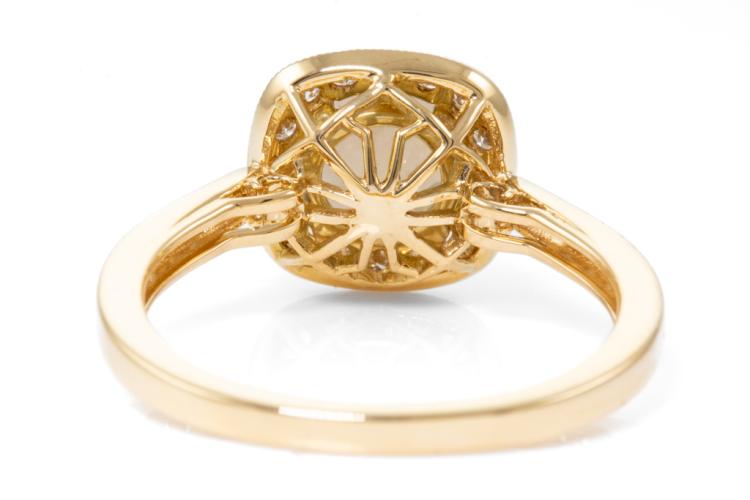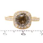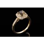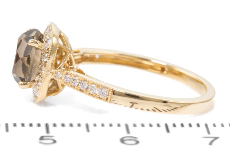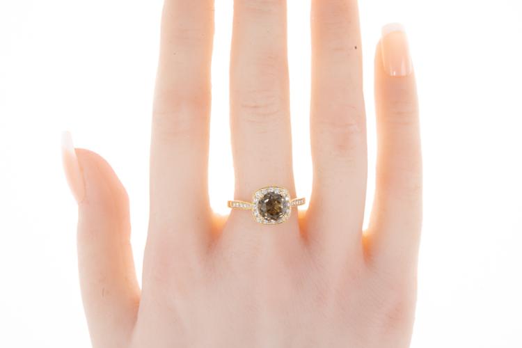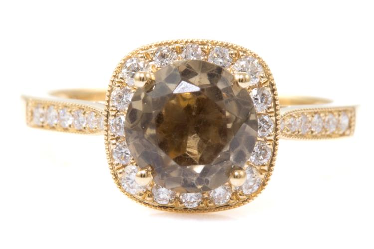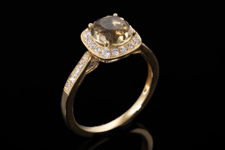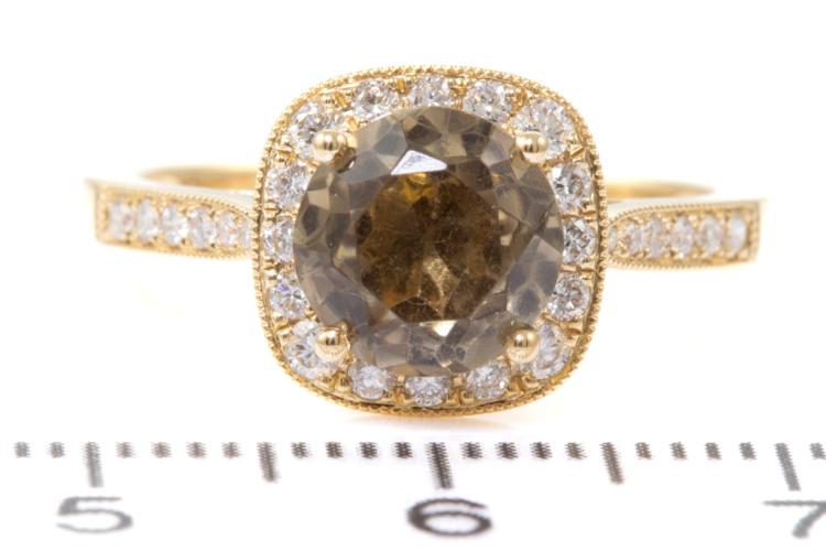 Quartz and diamond ring with centre round Smokey Natural Quartz of 1.87cts and remaining round Natural Diamonds totalling 0.32cts (Estimated grading: H-I VS-SI). 18ct yellow gold. Ring size N. Weight: 4.2g. (New)