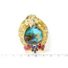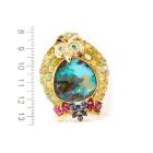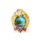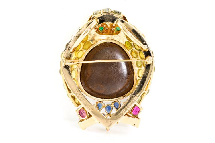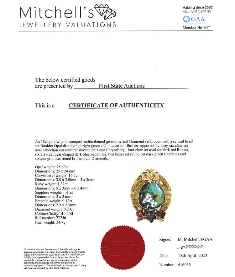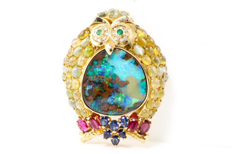 Multi-coloured Gemstone and Diamond owl design brooch with centre solid Boulder Opal of 25.40ct surrounding by oval cabochon cut cat's eye Chrysoberyl totalling 16.50cts, Rubies totalling 1.82cts, round Emerald totalling 0.12cts, oval shape Ruby totalling 1.32cts, pear shape blue Sapphire totalling 1.41cts and round Diamonds totalling 0.20cts. 18ct yellow gold. Weight: 34.7g. With Certificate #416933. (Pre-owned)