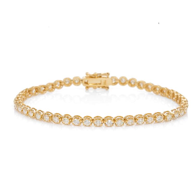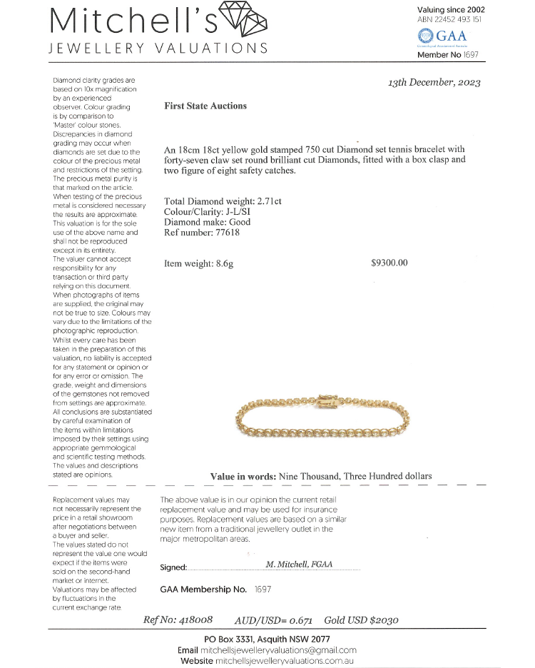 Diamond tennis bracelet with 47 round brilliant cut Natural Diamonds totalling 2.71cts. (Estimated grading: J-I SI). 18ct yellow gold. Length: 18cm. Weight: 8.6g. With Valuation Certificate #418008. (New)