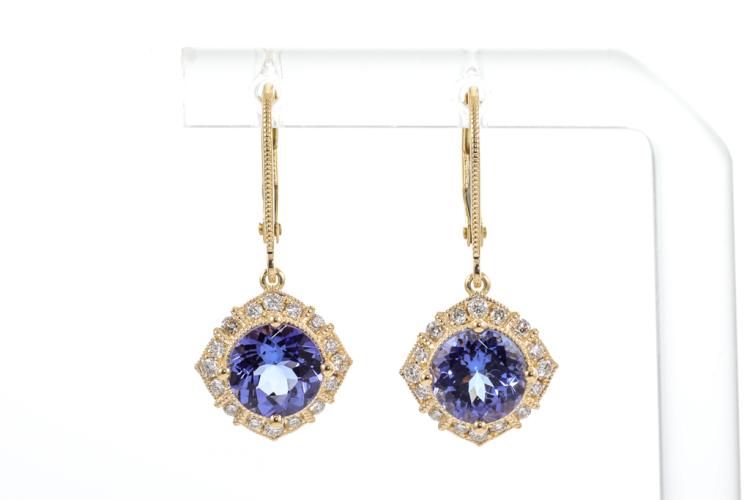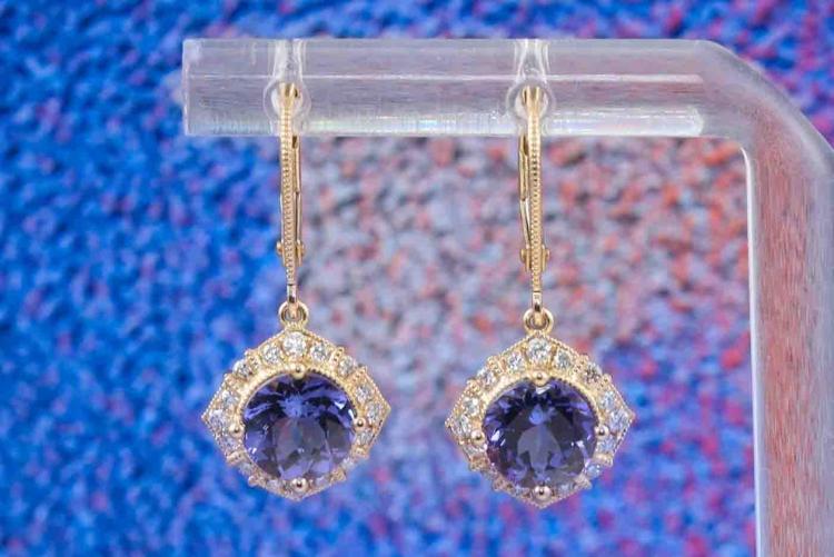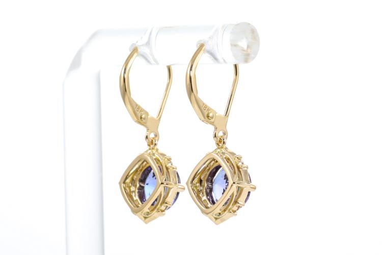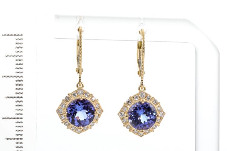 Tanzanite and Diamond lever back earrings with round natural Tanzanite totalling 2.83ct and round natural Diamonds totalling 0.35cts (Estimated grading: H SI). 18ct yellow gold. Weight: 4.4g. (New)