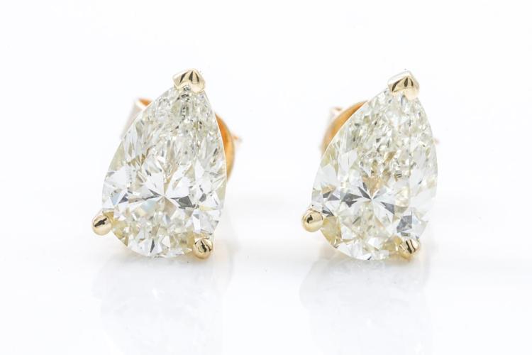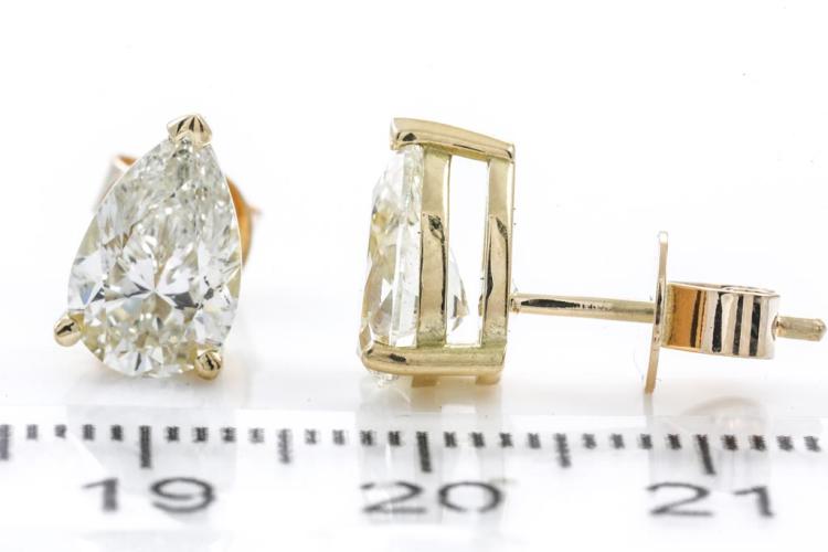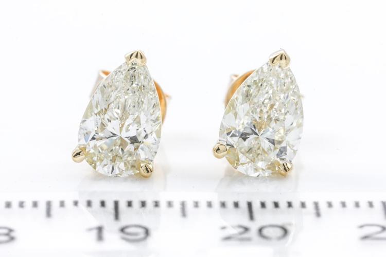 Diamond Stud earrings with 2 pear shape Natural Diamonds totalling 3.02cts (With GIA Reports graded as K SI1 & K SI2 #5222341478, 5426853921). 18ct yellow gold. Weight: 3.6g (New)