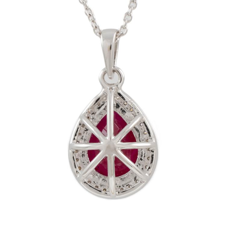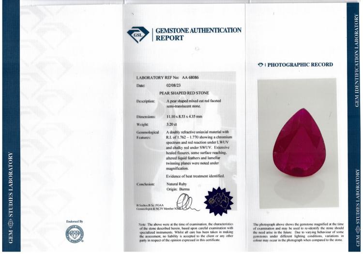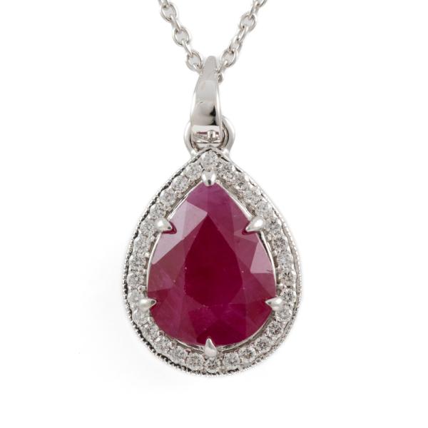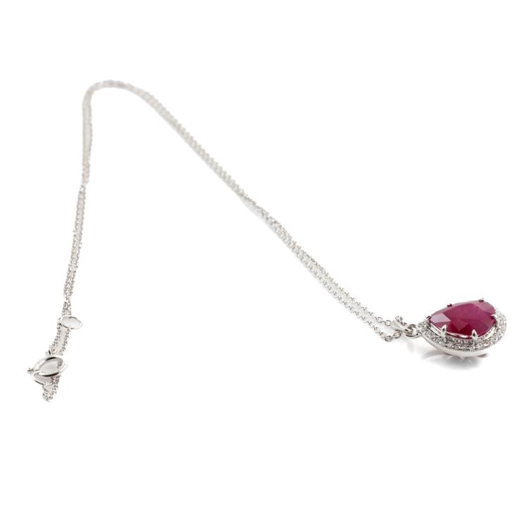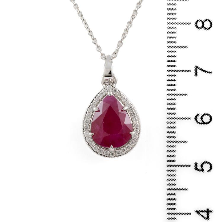 Ruby and Diamond pendant with a pear shape Burmese Natural Ruby of 3.20ct and round Natural Diamonds totalling 0.28cts. 14ct white gold with 14ct white gold adjustable 45cm chain. Weight: 4.8g. With GSL Report #AA68086. (As new)