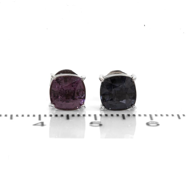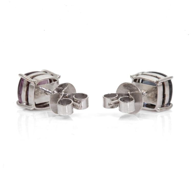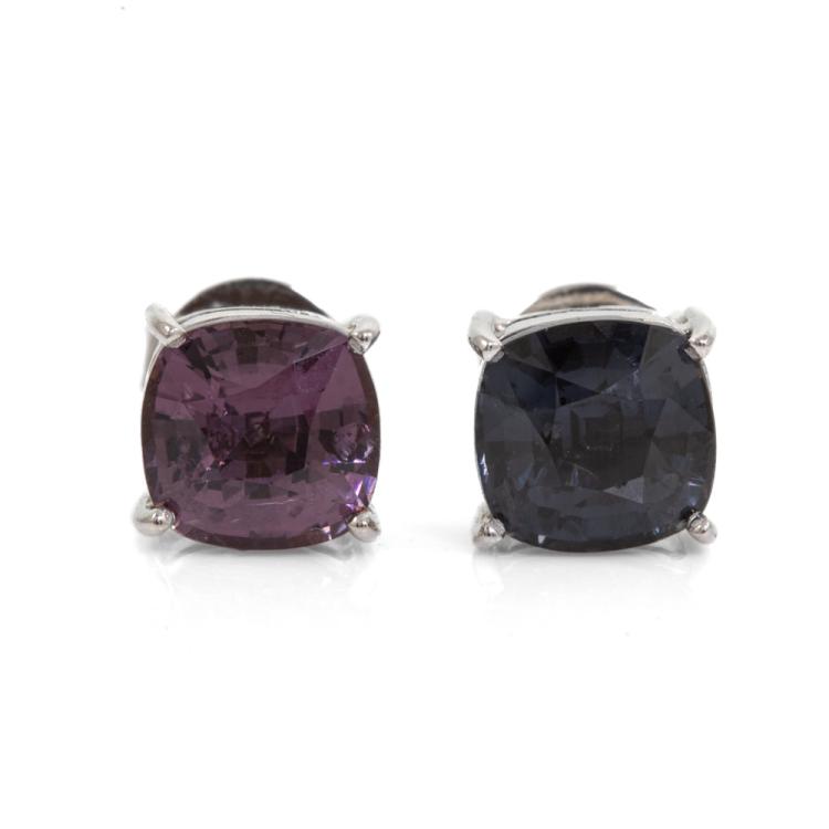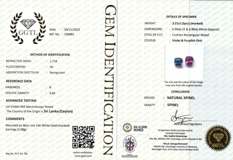 Spinel stud earrings with cushion cut violetish blue and purplish pink Ceylon Natural Spinel totalling 3.21cts. 14ct white gold. Weight: 2g. With GGTL report #200883. (As new)