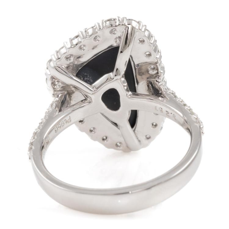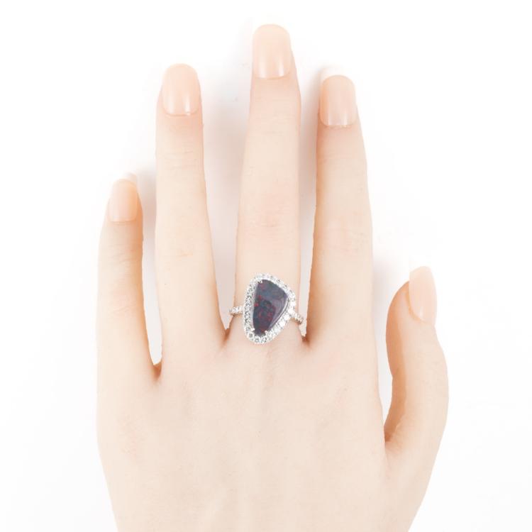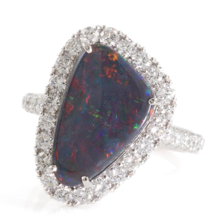 Opal and Diamond Ring with freestyle solid Natural Black Opal of 3.25ct and round Natural Diamonds totalling 0.95cts (Estimated grading: H-I SI). Platinum 950. Ring size L1/2. Band width: 2.2mm-3.2mm. Weight: 8.2g. With Certificate #418049. (Pre-owned)