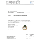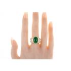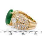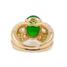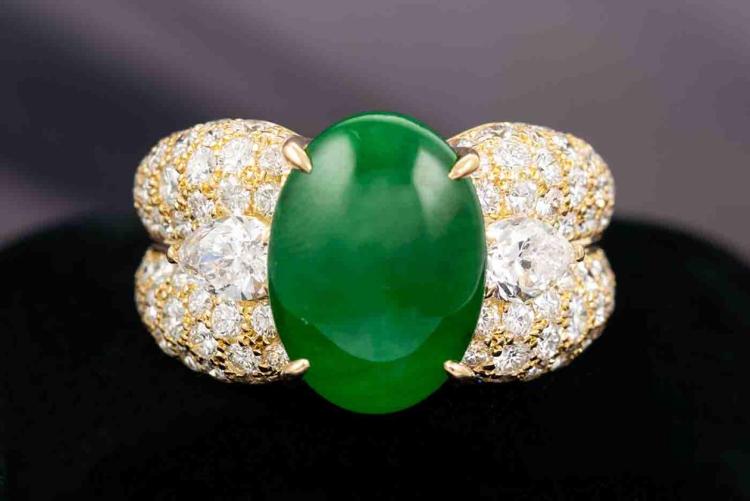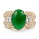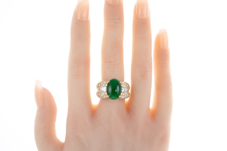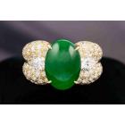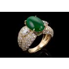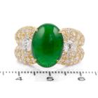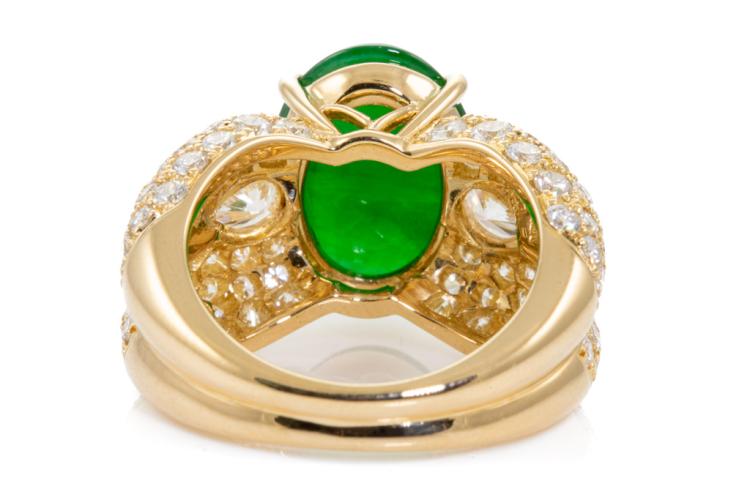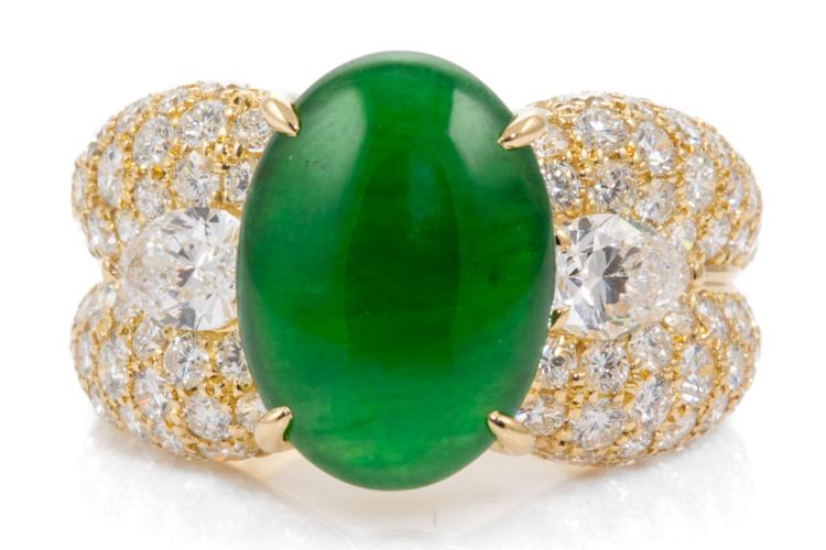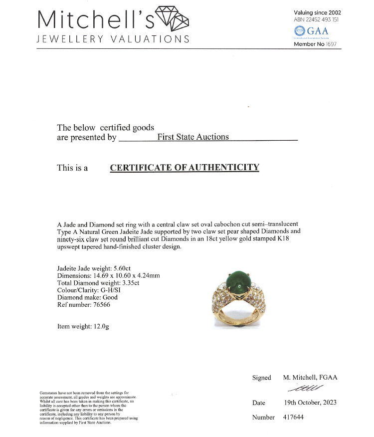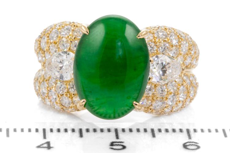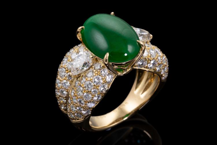 Jade and Diamond ring with oval cabochon cut Natural green Jadeite Jade - Type A of 5.60ct and pear shape & round Natural Diamonds totalling 3.35cts (Estimated grading: G-H SI). 18ct yellow gold . Ring size L1/2 - ring resizing is not recommended. Band width: 12.9mm - 3.69mm. Weight: 12.0g. With Certificate #417644. (Pre-owned)