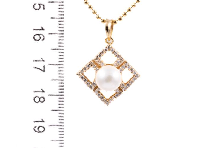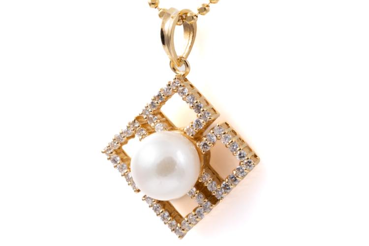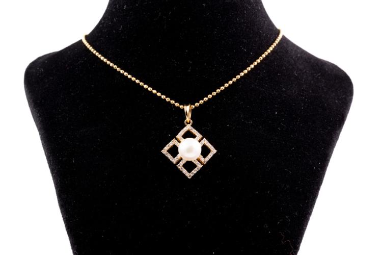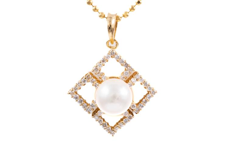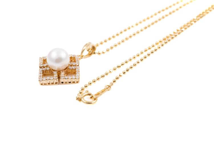 Pearl and Diamond pendant with Akoya of 8.2mm and round Natural Diamonds totalling 0.52cts (Estimated grading: I-J SI). 18ct yellow gold with 41cm 18ct yellow gold chain. Weight: 7.5g. (Pre-owned)