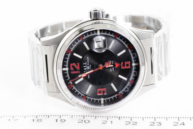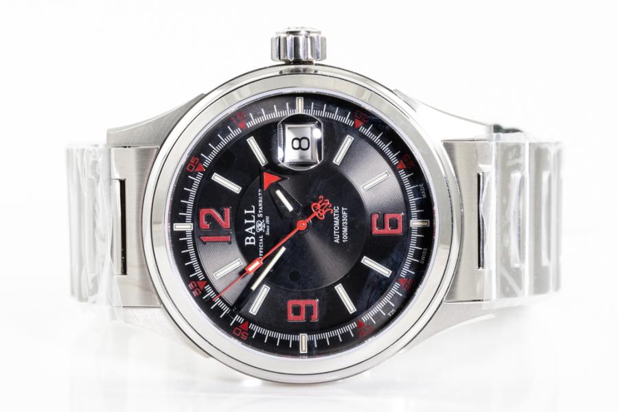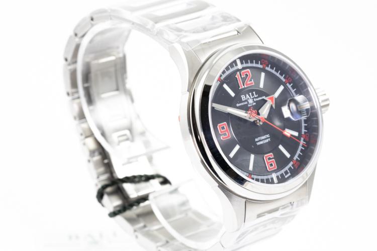 Ball Fireman Racer stainless steel automatic mens watch. Black dial, date, case diameter: 40mm, wrist size: 18.5cm, Swiss made. Ref# NM2088C-S2J-BKRD. With Ball stainless steel bracelet and clasp. With Ball Premium International Warranty Certificate Card and Ball box. 12 month FSA warranty (As new, Note: case and bracelet in original wrapping)