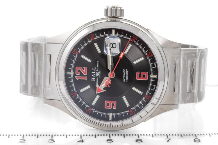Ball Fireman Racer stainless steel automatic mens watch. Black dial, date, case diameter: 40mm, wrist size: 19cm, Swiss made. Ref# NM2088C-S2J-BKRD. With Ball stainless steel bracelet and clasp. With Ball Premium International Warranty Certificate and Ball box. 12 month FSA warranty (As new, Note: case and bracelet on original wrapping)