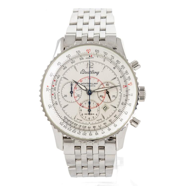 Breitling Montbrillant Navitimer stainless steel automatic watch. Silver chronograph dial, date, case diameter: 38mm, wrist size: 18.5cm, Swiss made. Ref# A41330. With Breitling stainless steel bracelet and clasp. With Certificate of Authenticity and Breitling box. 3 month FSA warranty (Pre-owned)