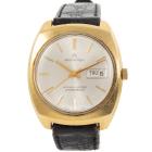 Bucherer Vintage 18ct yellow gold automatic watch. Silver dial, day & date, approximate case diameter: 36mm, Swiss made. Ref# 26302728. With unbranded leather strap and steel buckle. With Certificate of Authenticity. No warranty applies. (Pre-owned)