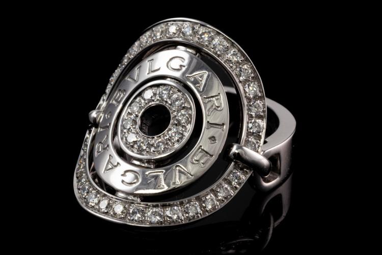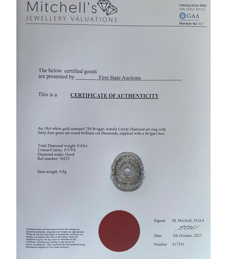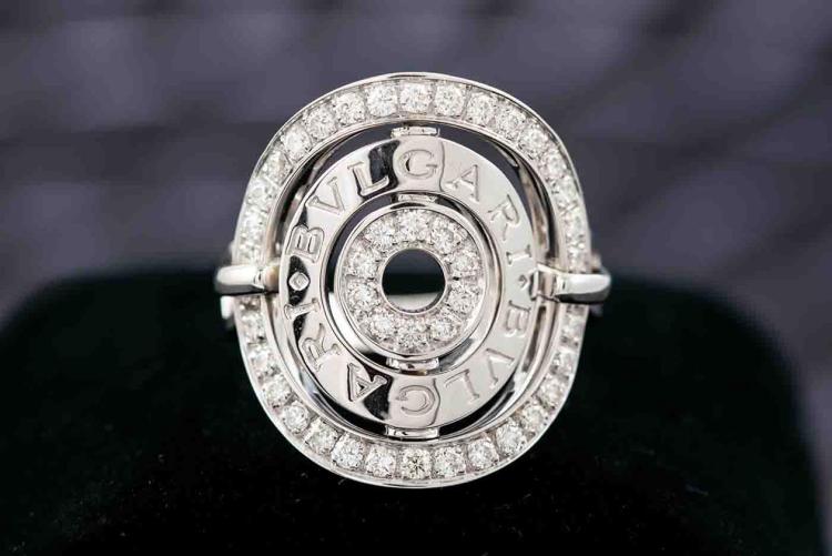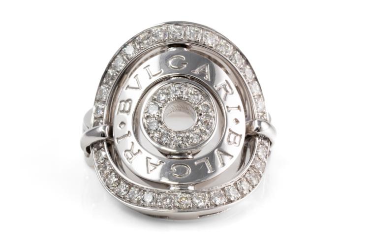 Bvlgari Astrale Cerchi ring with round Natural Diamonds totalling 0.65cts (Estimated grading: F VVS). 18ct white gold. Ring size J 1/2 - ring resizing is not recommended. Weight: 9.8g. With Bvlgari box. With Certificate #417591. (Pre-owned)
