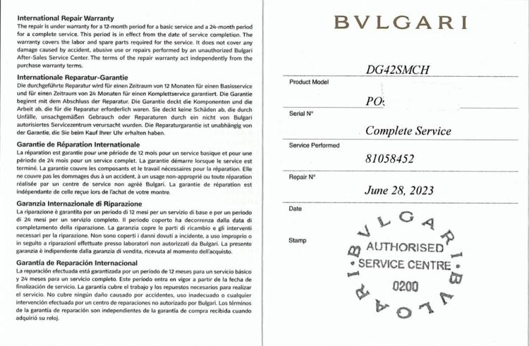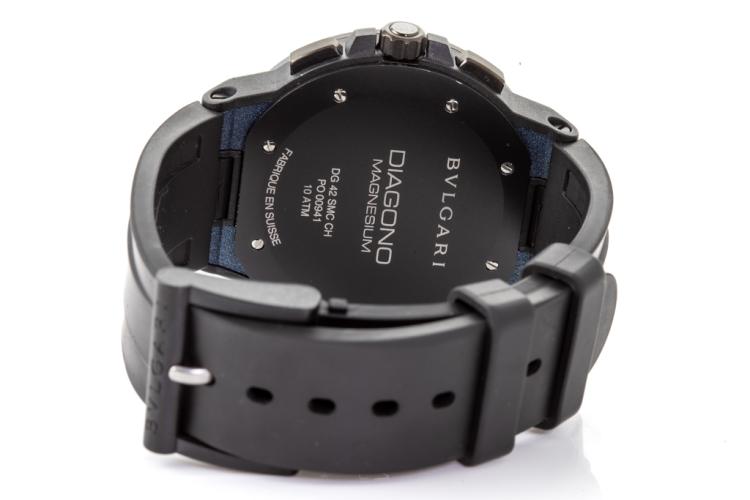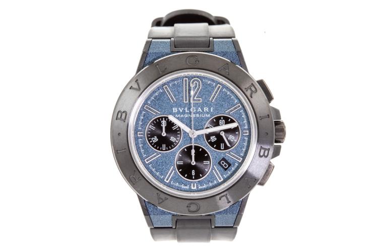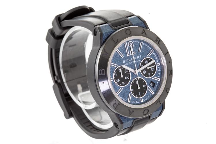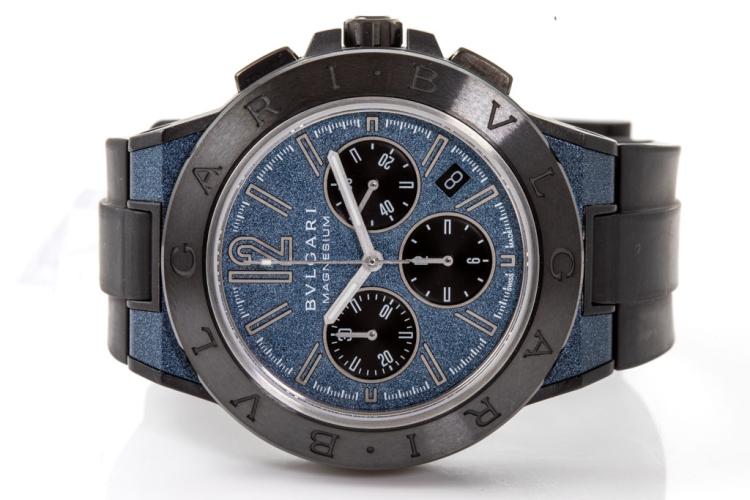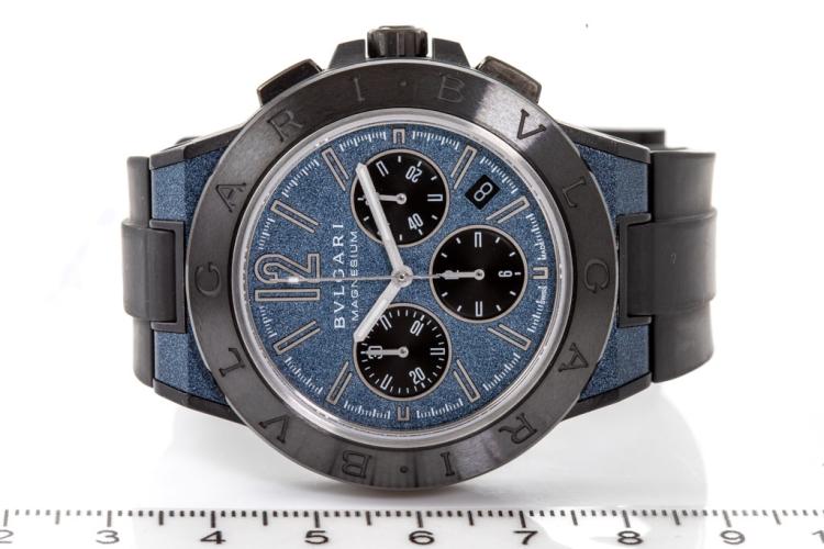 Bvlgari Diagono Magnesium ceramic automatic mens watch. Blue chronograph dial, date, case diameter: 42mm, strap length: 22cm, Swiss made. Ref# DG42SMCH. With Bvlgari black rubber strap and buckle. With Bvlgari International Repair Warranty certificate dated 28/06/2023, Bvlgari Tax Invoice dated 17/07/2023 and Bvlgari case and gift bag. 12 month Bvlgari warranty from the date of Complete Service. (Pre-owned)