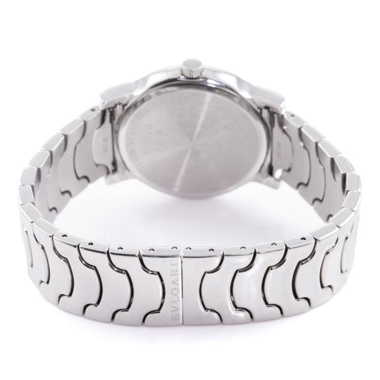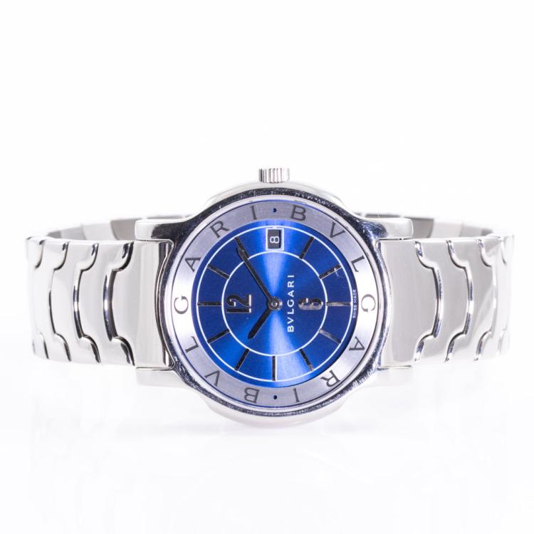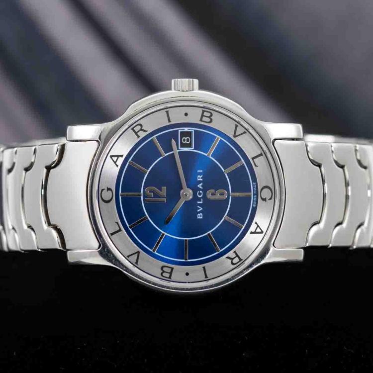 Bvlgari Solotempo stainless steel quartz watch. Blue & silver dial, date, case diameter: 35mm, wrist size: 16.5cm, Swiss made. Ref# ST35S. With Bvlgari stainless steel bracelet and clasp. With Certificate of Authenticity. 3 month FSA warranty. (Pre-owned)