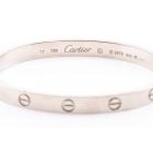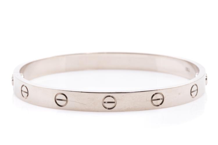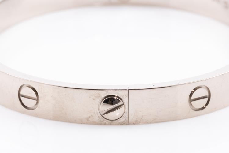 Cartier love bangle. 18ct white gold. Width: 6.1mm. Cartier stamped size 17. Weight: 33.7g. With Certificate #417612. (Pre-owned)