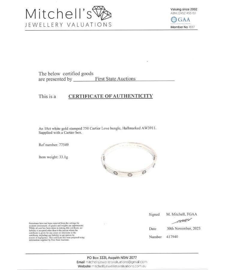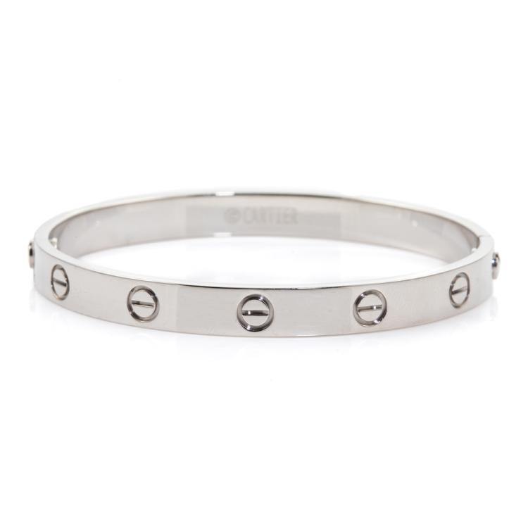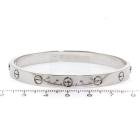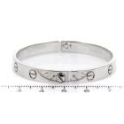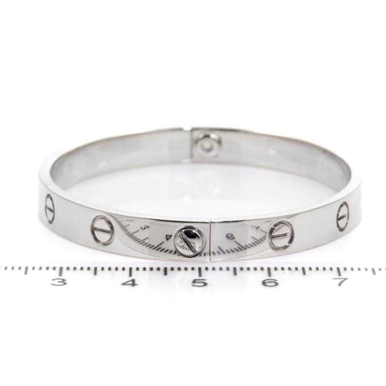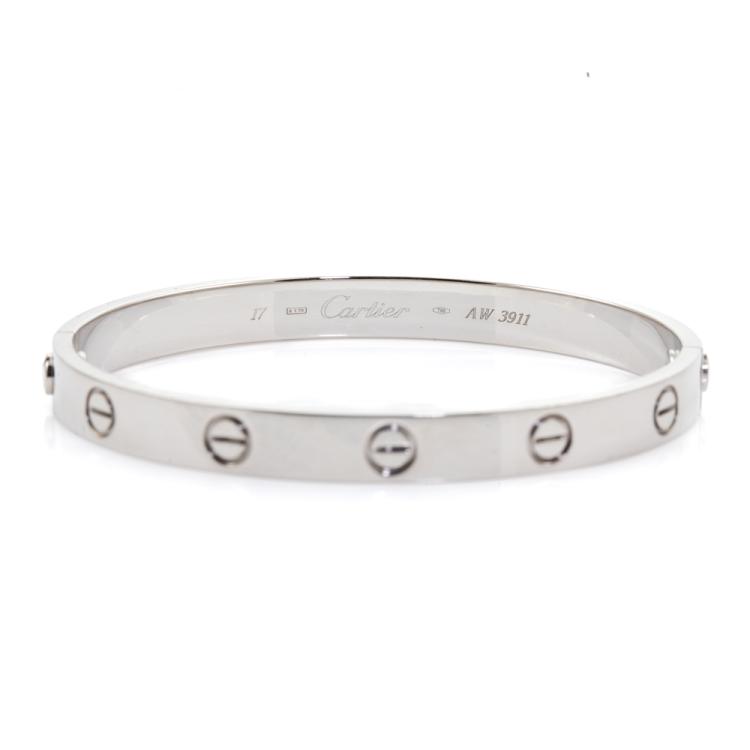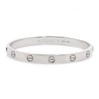 Cartier love bracelet. 18ct white gold. Stamped size 17. Width: 6.1mm. Weight: 33.1g. With Cartier box. With Certificate #417940. (Pre-owned)