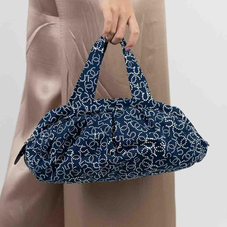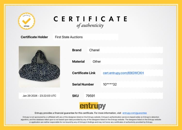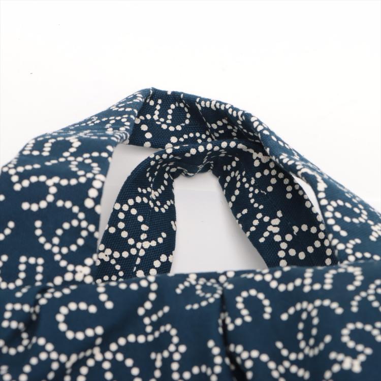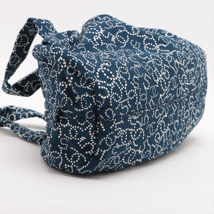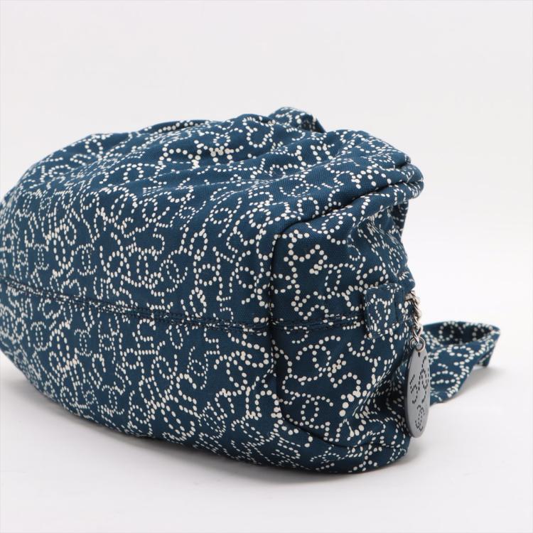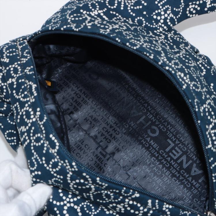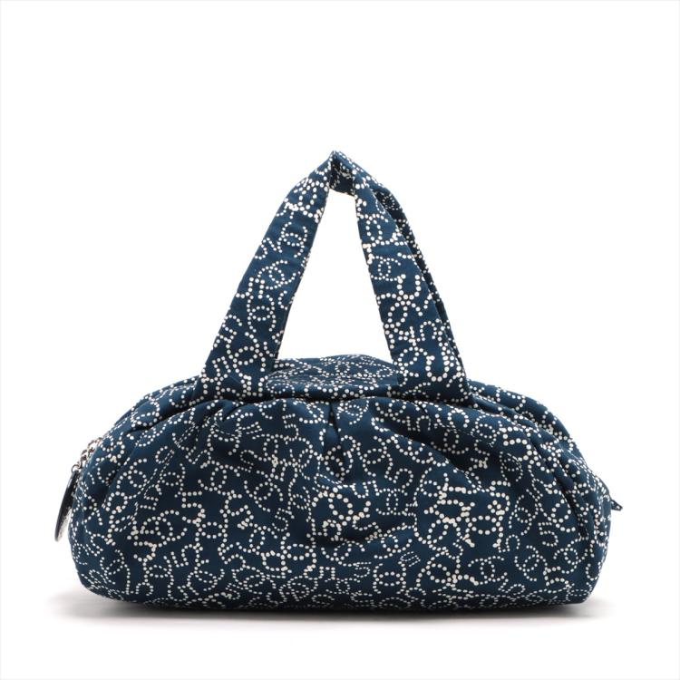 Chanel No5 travel bag in navy blue canvas. Featuring CC & No5 logo printed exterior, silver-toned hardware, zipper closure with a logo detailed pendant on top. The top opens to a Chanel logo embossed fabric lining interior with a zipped pocket. Approximate dimensions: 32cm(L) x 12.5cm(H) x 17cm(D), 14cm handle drop. Accompanied by Chanel certificate card and a dust bag. With Entrupy Certificate of Authenticity. (Pre-owned)