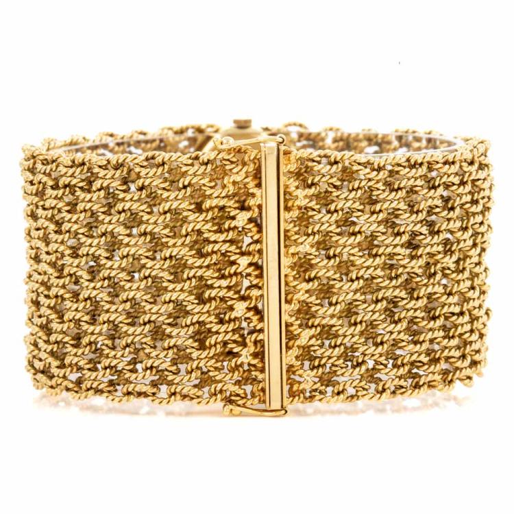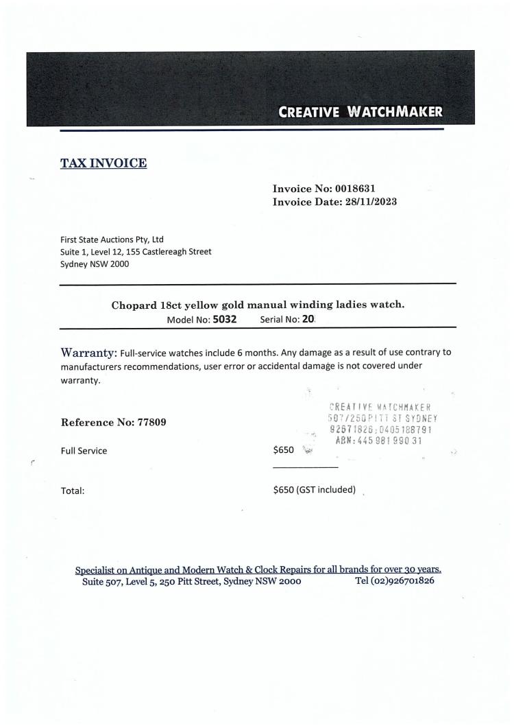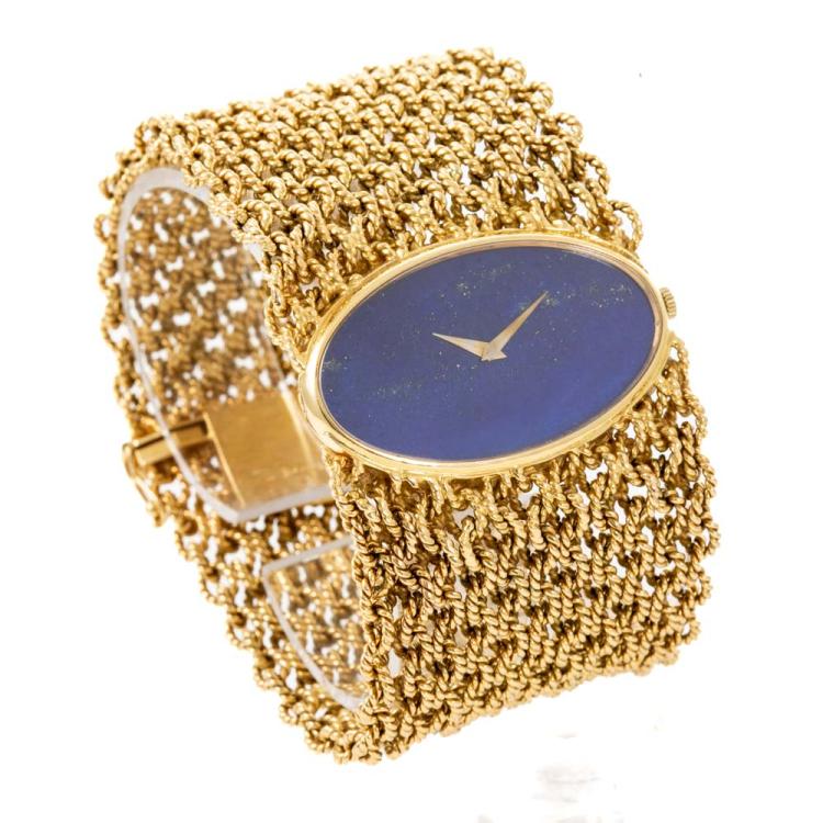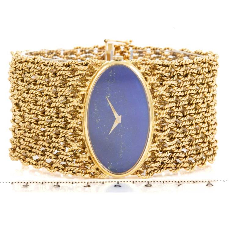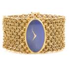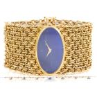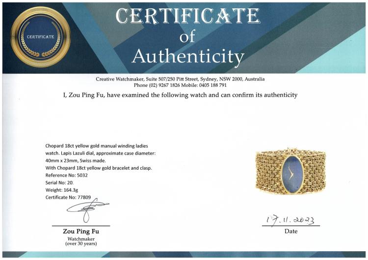Chopard 18ct yellow gold manual winding ladies watch. Lapis Lazuli dial, approximate case diameter: 40mm x 23mm, wrist size: 19.5cm, Swiss made. Ref# 5032. With Chopard 18ct yellow gold bracelet and clasp. With Certificate of Authenticity and Chopard box. 6 month Creative Watchmaker warranty from the date of full service. (Pre-owned)