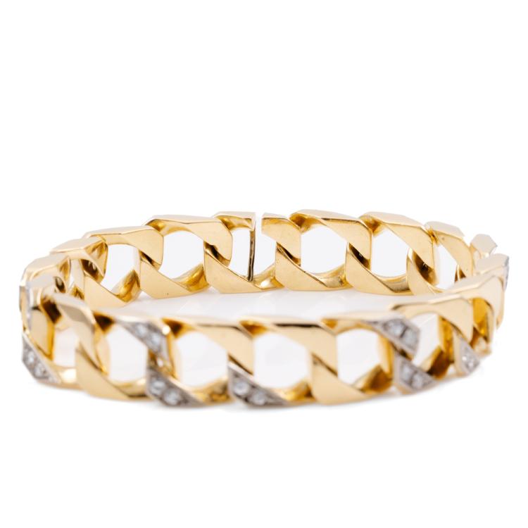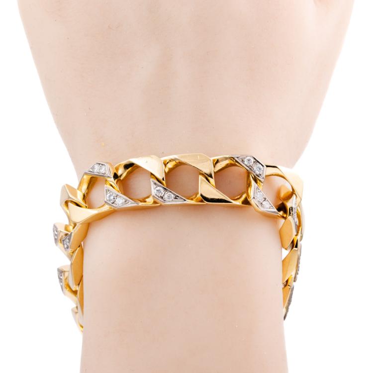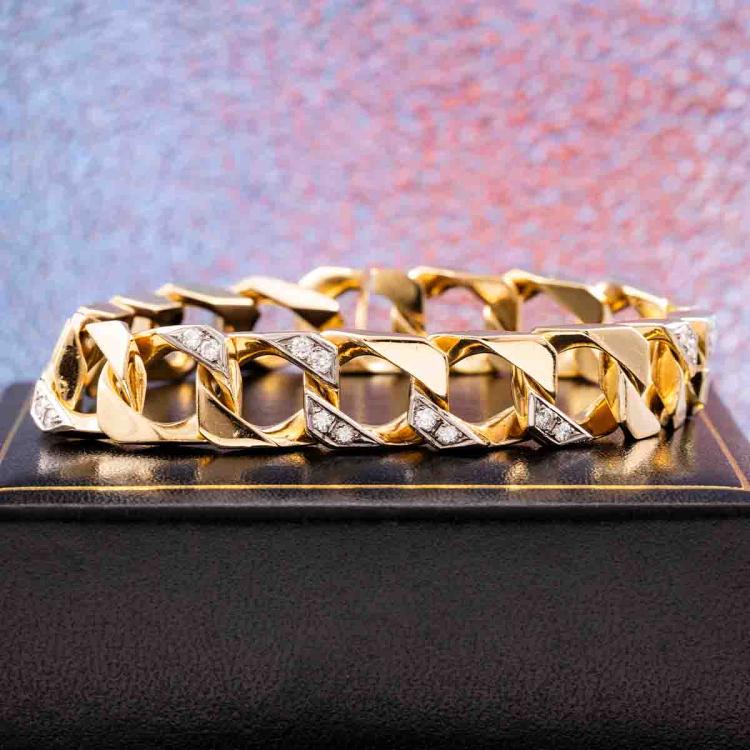 18ct yellow and white gold curb link bracelet with round Natural Diamonds totalling 1.80cts (Estimated grading: G-H VS-SI). Length: 21.5cm. Width: 13.3mm. Weight: 81.5g. With Valuation dated 03/08/23. (Pre-owned)