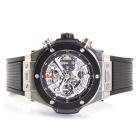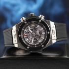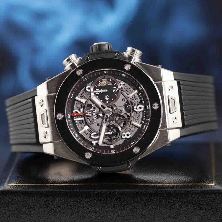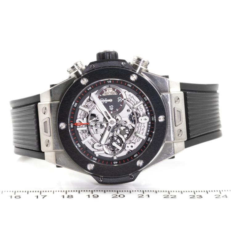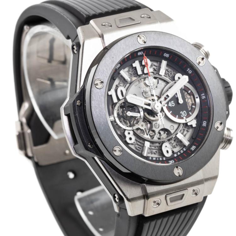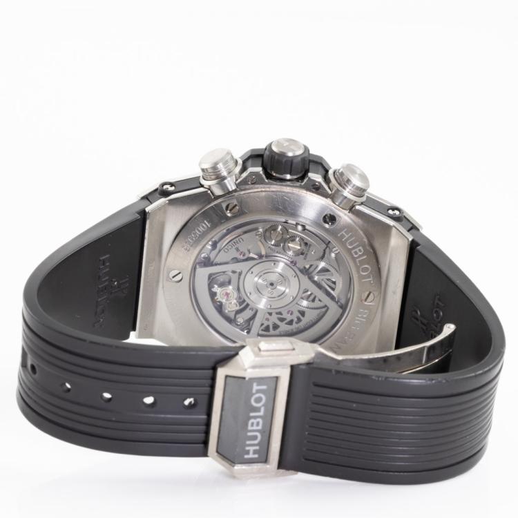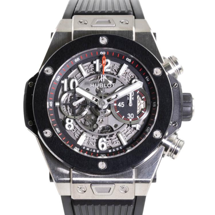 Hublot Big Bang Unico titanium and ceramic automatic mens watch. Skeleton dial, case diameter: 42mm, adjustable max wrist size: 20cm, Swiss made. Ref# 441.NM.1170.RX. With Hublot black rubber strap and clasp. With Certificate of Authenticity. 3 month FSA warranty. (Pre-owned)
