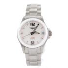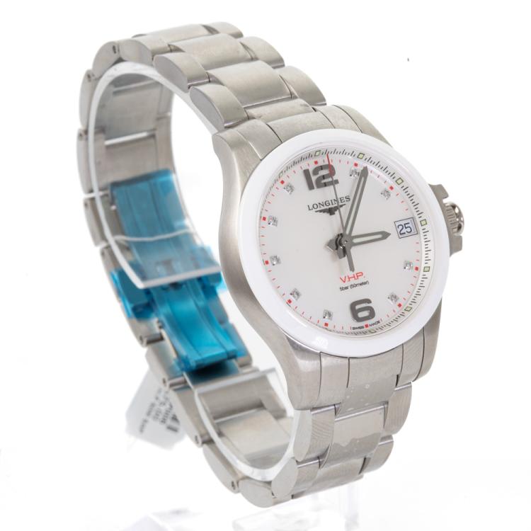 Longines Conquest stainless steel quartz watch. Mother of Pearl dial, Diamond indicators, date, case diameter: 36mm, wrist size: 19.5cm, Swiss made. Ref# L3.319.4.87.6. With Longines stainless steel bracelet and clasp. With FSA Certificate and Authenticity, Longines Diamond Certificate card and Longines box. 3 month FSA warranty (As new, Note: minor scratches on case and bracelet due to being display stock)