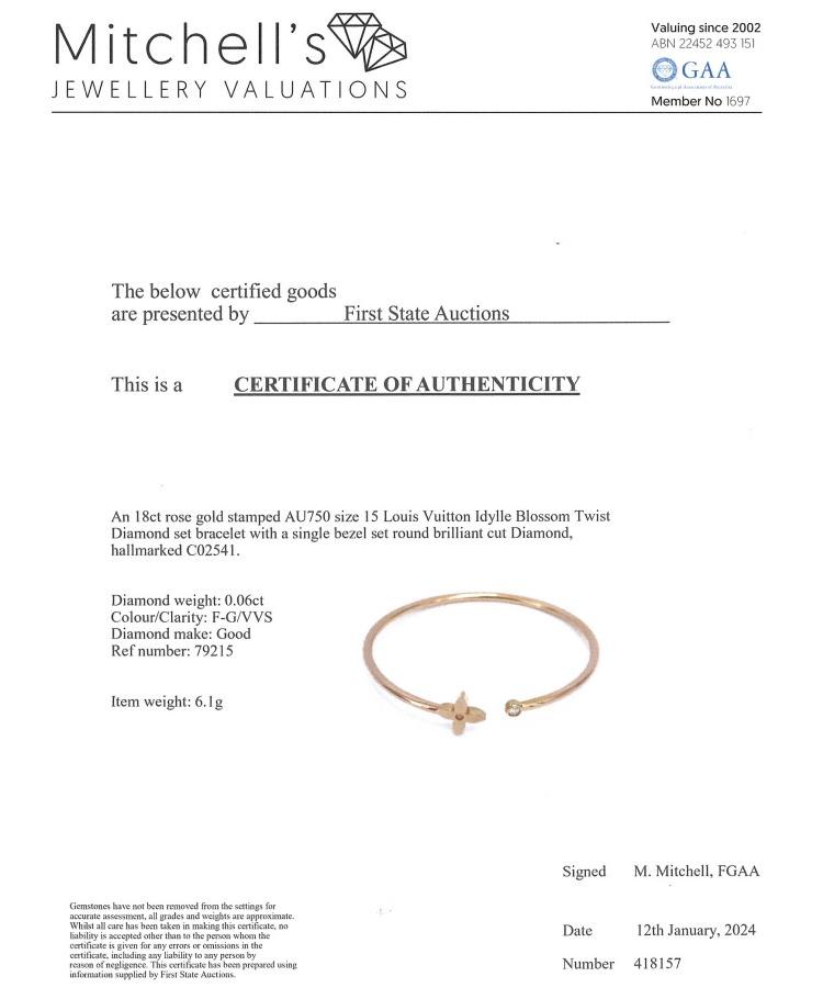 Louis Vuitton Idylle Blossom Twist bracelet with a round Natural Diamond of 0.06ct. 18ct rose gold. Louis Vuitton stamped wrist size 15 (equivalent to Louis Vuitton size Medium). Width: 2.3mm. Weight: 6.1g. With Certificate #418157. (Pre-owned)