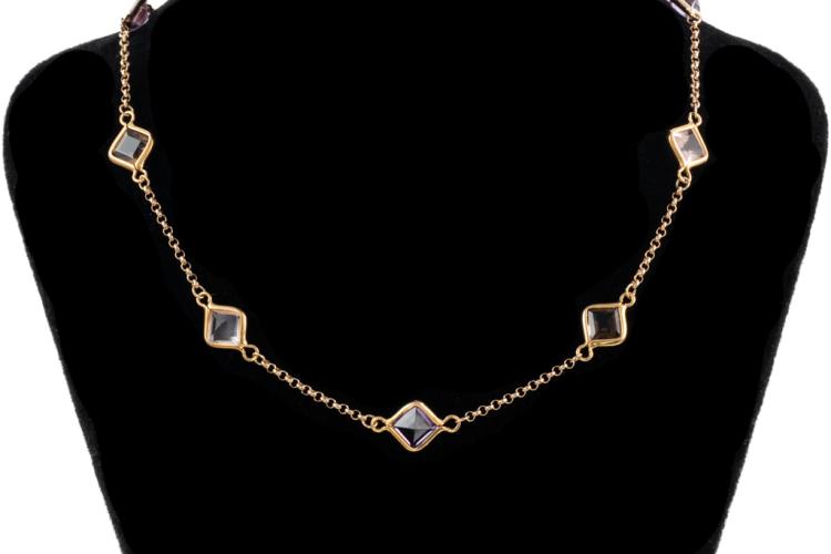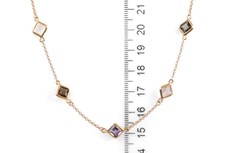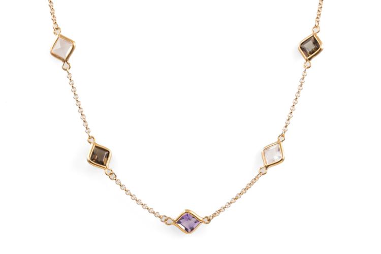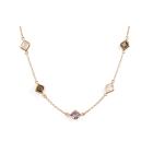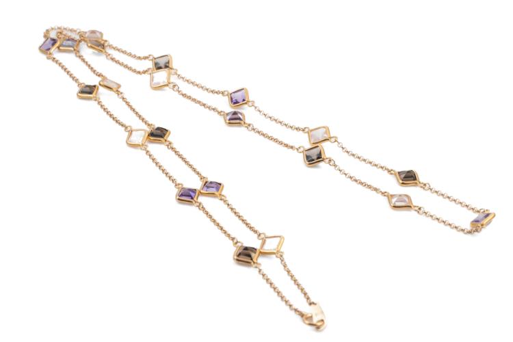 Mixed Gemstone necklace with carre cut Natural Amethyst, Rose & Smokey Quartz totalling 13.10cts. 18ct rose gold. Length: 71cm. Weight: 10.8g. (Pre-owned)