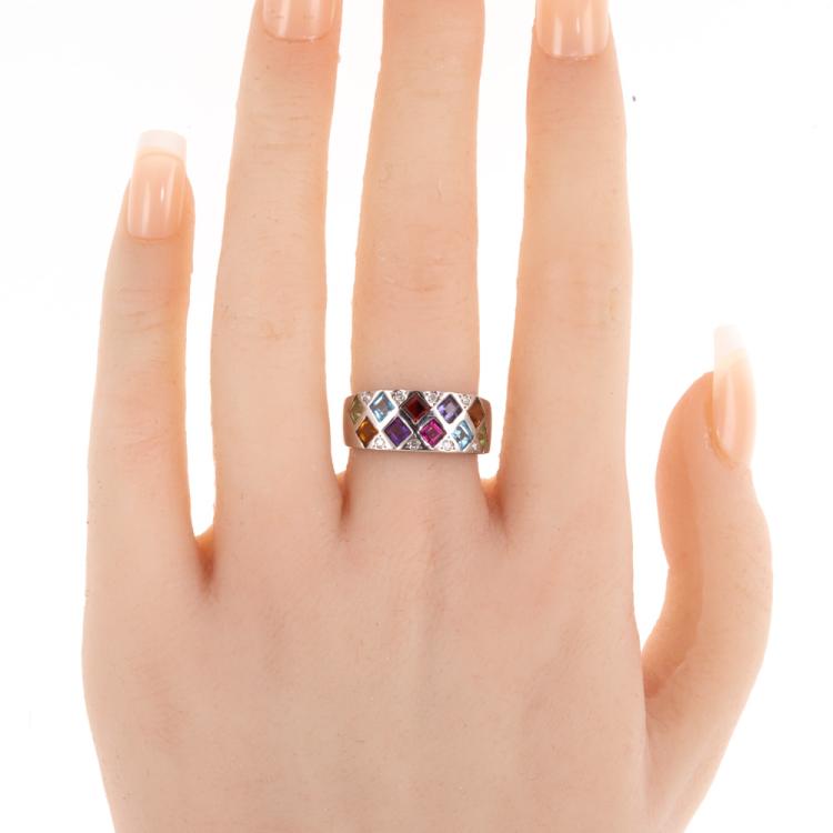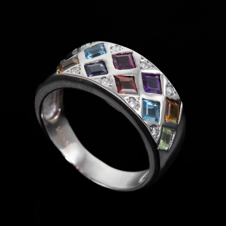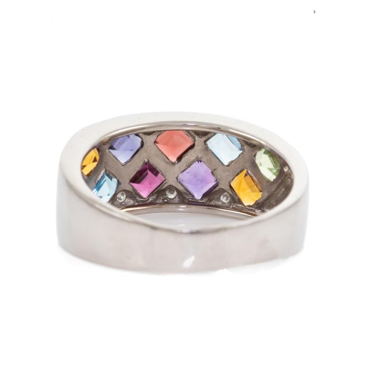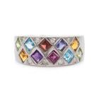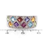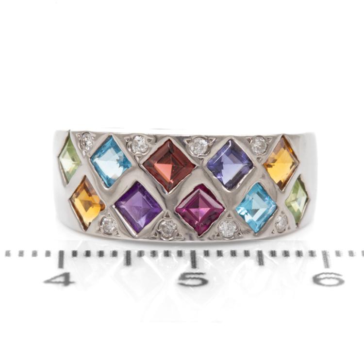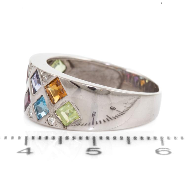 Mixed Gemstones and Diamond ring with carre cut Natural Gemstones totalling 1.20cts (including: Peridots, Citrines, Topazs, Tanzanite, Amethyst, red Garnet and pink Tourmaline) and round Natural Diamonds totalling 0.04cts. 18ct white gold. Ring size M1/2. Band width: 7.3mm - 3.8mm. Weight: 4.5g. (Pre-owned)