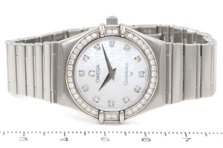 Omega Constellation stainless steel quartz ladies watch. Mother of Pearl dial, Diamond indicators and set bezel, case diameter: 25.5mm, wrist size: 16.5cm, Swiss made. Ref# 14587500. With Omega stainless steel bracelet and clasp. With Certificate of Authenticity, Omega International Warranty Card, Omega Precious Stones Certificate card, Omega Pictograms card and Omega box. With 3 Months FSA Warranty. (Pre-owned)