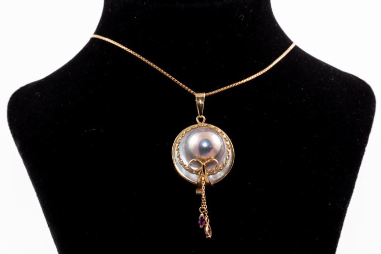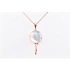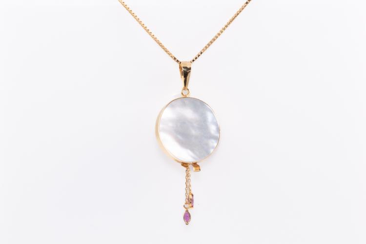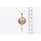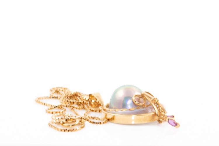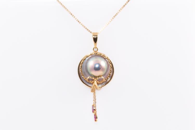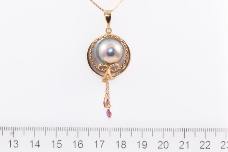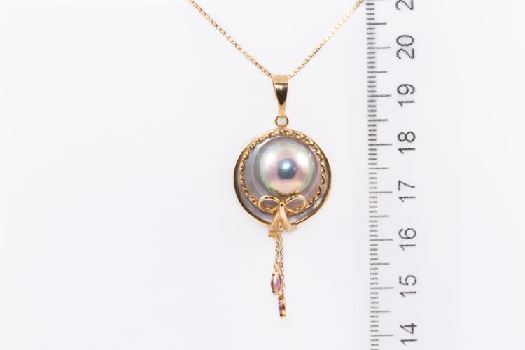 Pearl and Diamond pendant with Tahitian Pearl of 12.4mm on Mother of Pearl and 2 marquise cut Natural Rubies totalling approximately 0.20cts. Pendant diameter: 20.0mm. 18ct yellow gold with 42cm 18ct yellow gold adjustable chain (note small solder mark on chain). Weight: 8.0g. (Pre-owned)