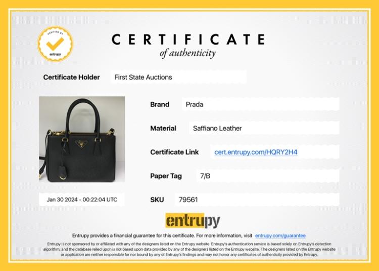 Prada medium Galleria bag in black Saffiano leather. Featuring gold-toned hardware, dual leather handles, 2 external zipper pockets, logo plate at front, snap closures on sides. The top opens to a logo-print nylon lining interior with pockets. Approximate dimensions: 28.5cm(L) x 20cm(H) x 13cm(D), 12cm handle drop and 60cm strap drop. Accompanied by certificate card, booklets, keyring and dust bag. With Entrupy Certificate of Authenticity. (Pre-owned)