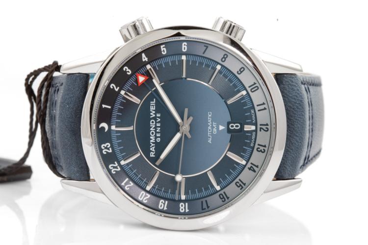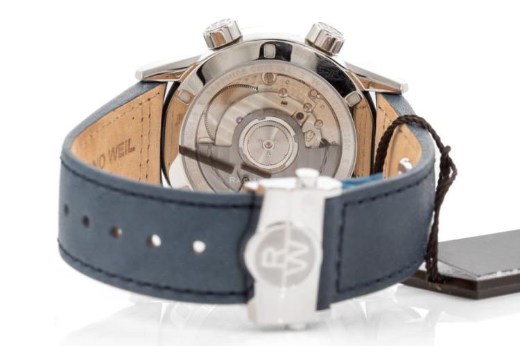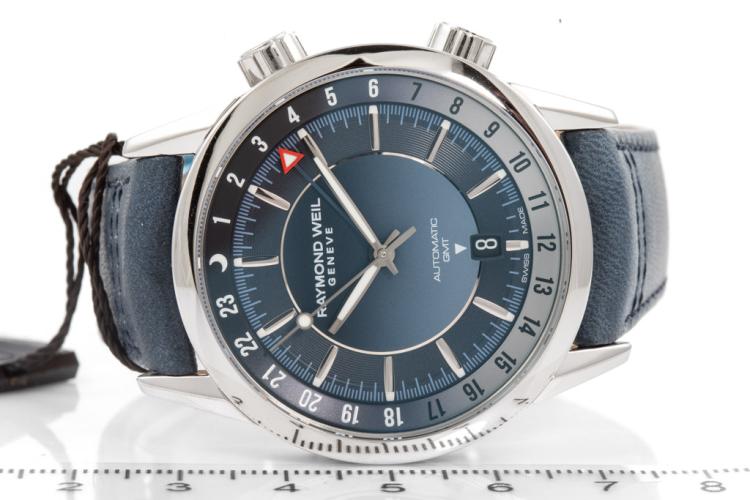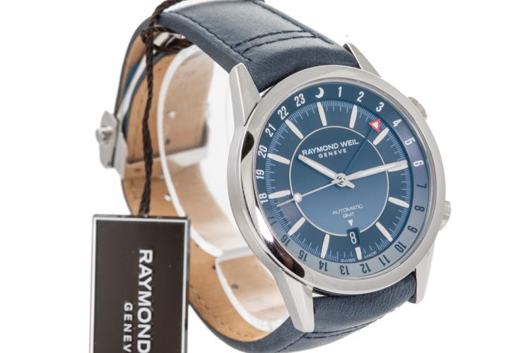 Raymond Weil Freelancer stainless steel automatic mens watch. Blue dial, date, case diameter: 40.5mm, strap length: 21.5cm, Swiss made. Ref# 2761-STC-50001. With Raymond Weil Blue leather strap and clasp. With Raymond Weil International Guarantee card and Raymond Weil box. 12 month FSA warranty (As new, Note: case in original warping and light wear on strap due to being display stock)